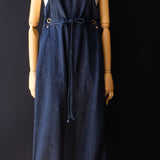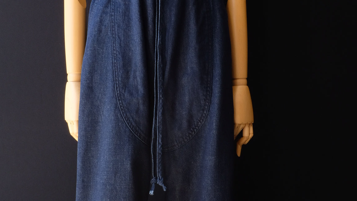 Kapital's Denim Welder Overall is a unique take on the average workwear style. Produced with a lightweight deep indigo dyed denim, and finished with custom brass eyelets & rivets. An oversized hip block and wide leg pant are flexible & comfortable, cinched above the hip with a self-tie waistband. Deep on-seam pockets, double-lined & reinforced front panel and continuous shoulder straps are just a few of the surprising details to this lifelong piece. Design unparalleled, this style is familiar & altogether different, specially constructed & not touched elsewhere in the market. Mannequin has a 26" waist and is wearing the size 1.