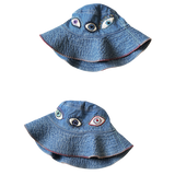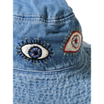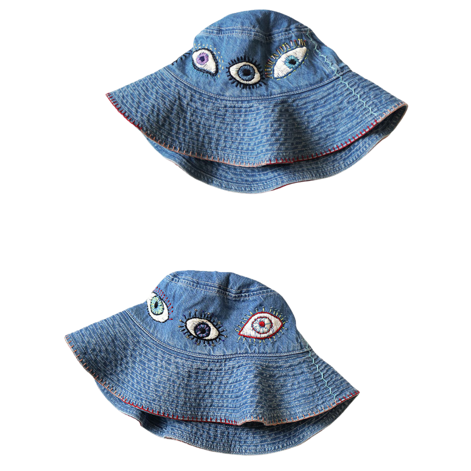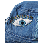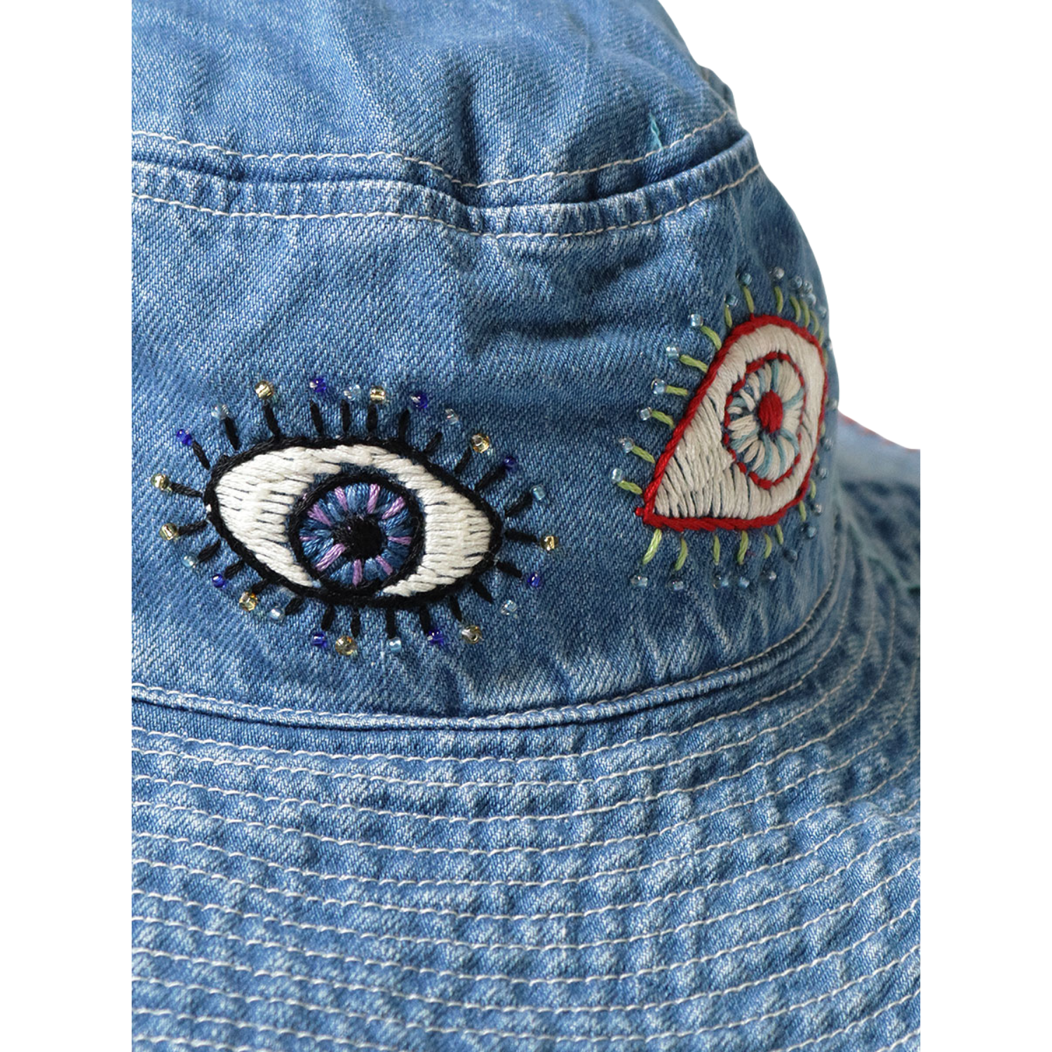 The Speakeasy Bucket Hat from Kapital is made from 12oz denim and has been intricately embroidered with glass beads and an eye motif. Contrasting stitching throughout with a great versatile size that fits most.