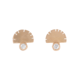 The Aquilla Stud Earrings feature 5 mm wide Semi circles of gold with randomly placed grooves. A .03 ct. conflict free white diamond is bezel set at the center of 14k yellow gold ear posts and nuts. Handmade in Denver, Colorado, all Young in the Mountains pieces use cruelty-free stones mined in the US.