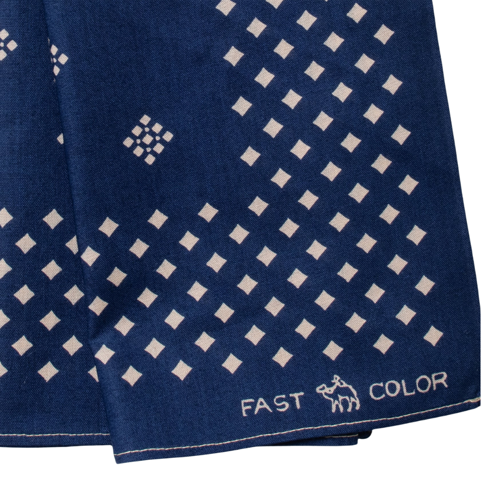 Inspired by Camel Brand Bandanas from the 1930-40s, a rare sub-brand of Elephant Brand Bandanas. One Ear Brand has made a thoughtful reproduction of a handful of the original designs and given them a new, high-quality twist for bandana enthusiasts to enjoy again. Carefully printed on 100% selvedge cotton fabric and sized in a 50cm x 50cm. A smaller version that One Ear Brand typically does not offer, as a nod to the original. Washing is recommended before use for best results and softness. Hang Dry.