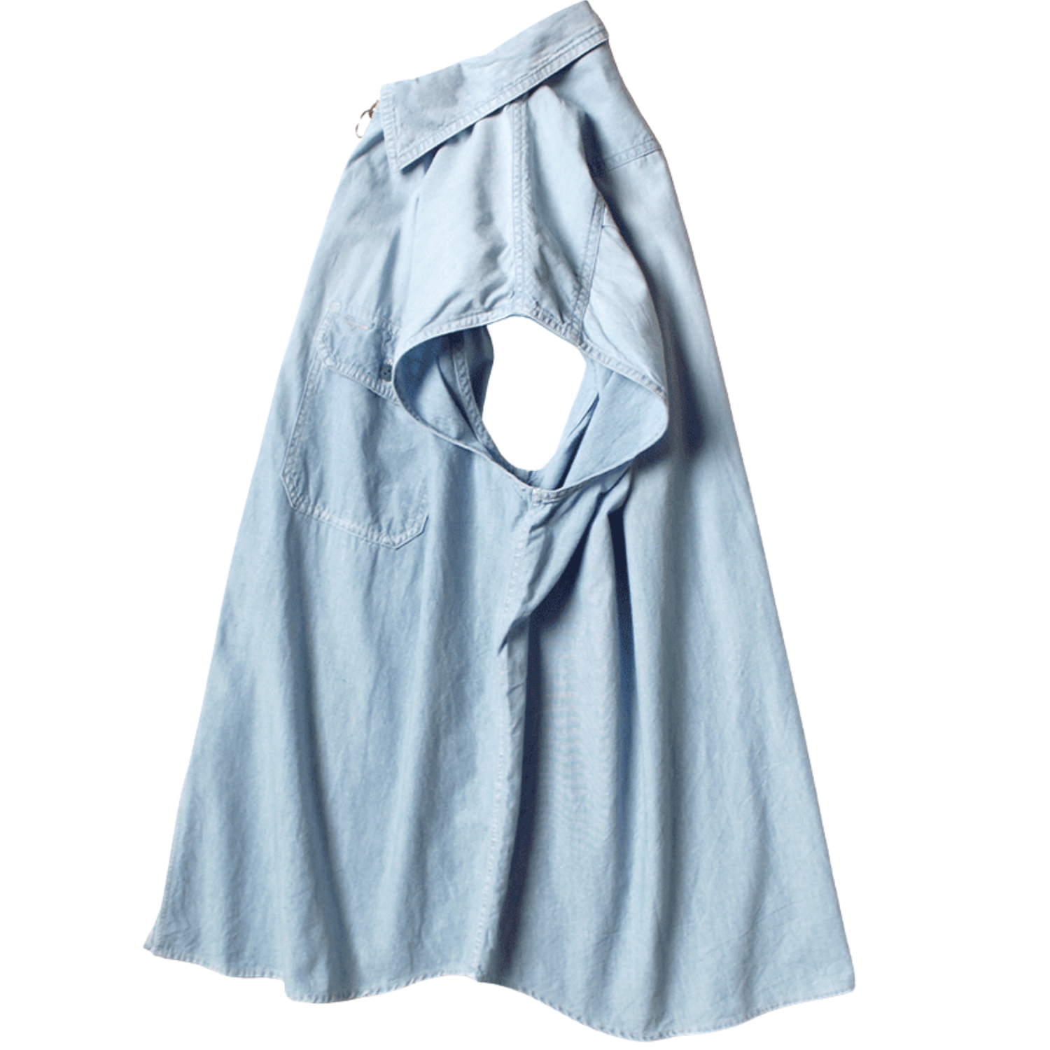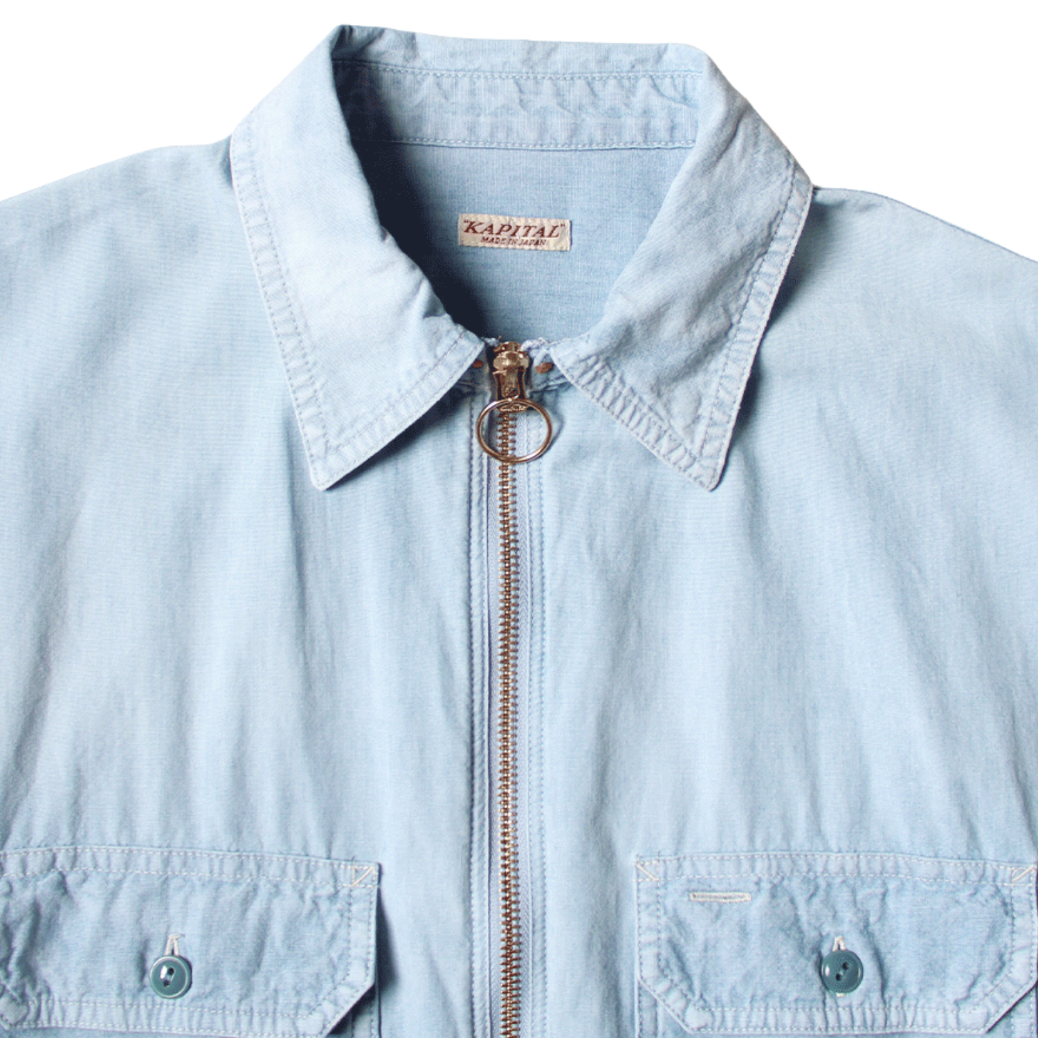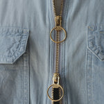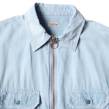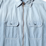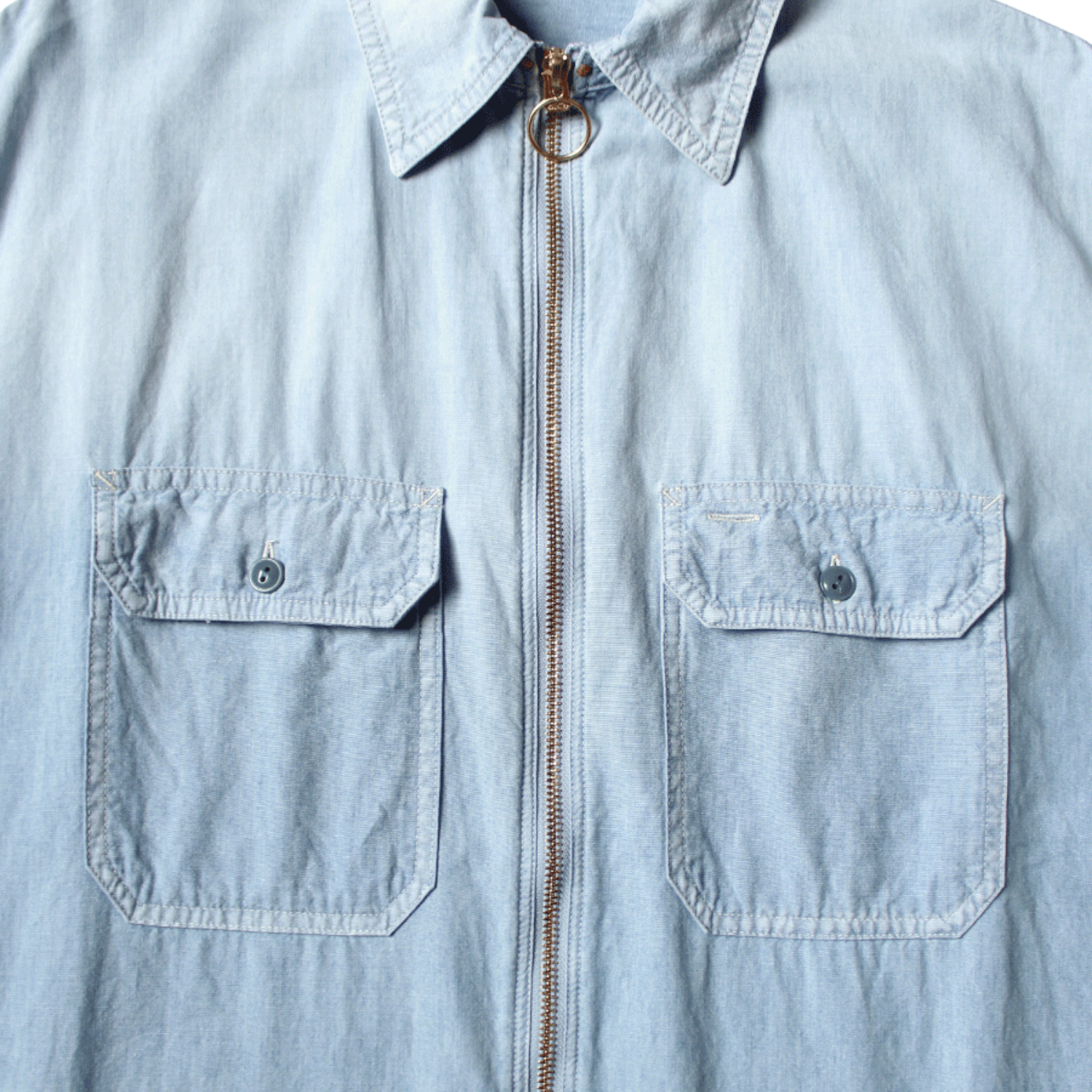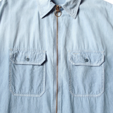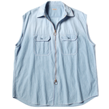 Treated to give a vintage look and feel, the Chambray Zipper Work Shirt is a versatile option to wear as a light overlayer. Light in weight with concise pleats at back, this shirt drapes nicely without feeling too bulky. Detailed with a gold two-way zipper and ring pulls. Fits true to size for an oversized fit. Mannequin has a 34" bust and is wearing the size 1.