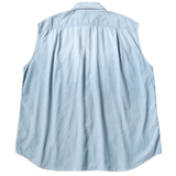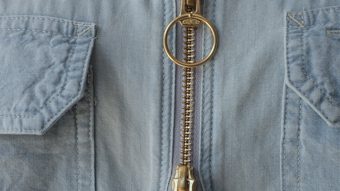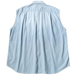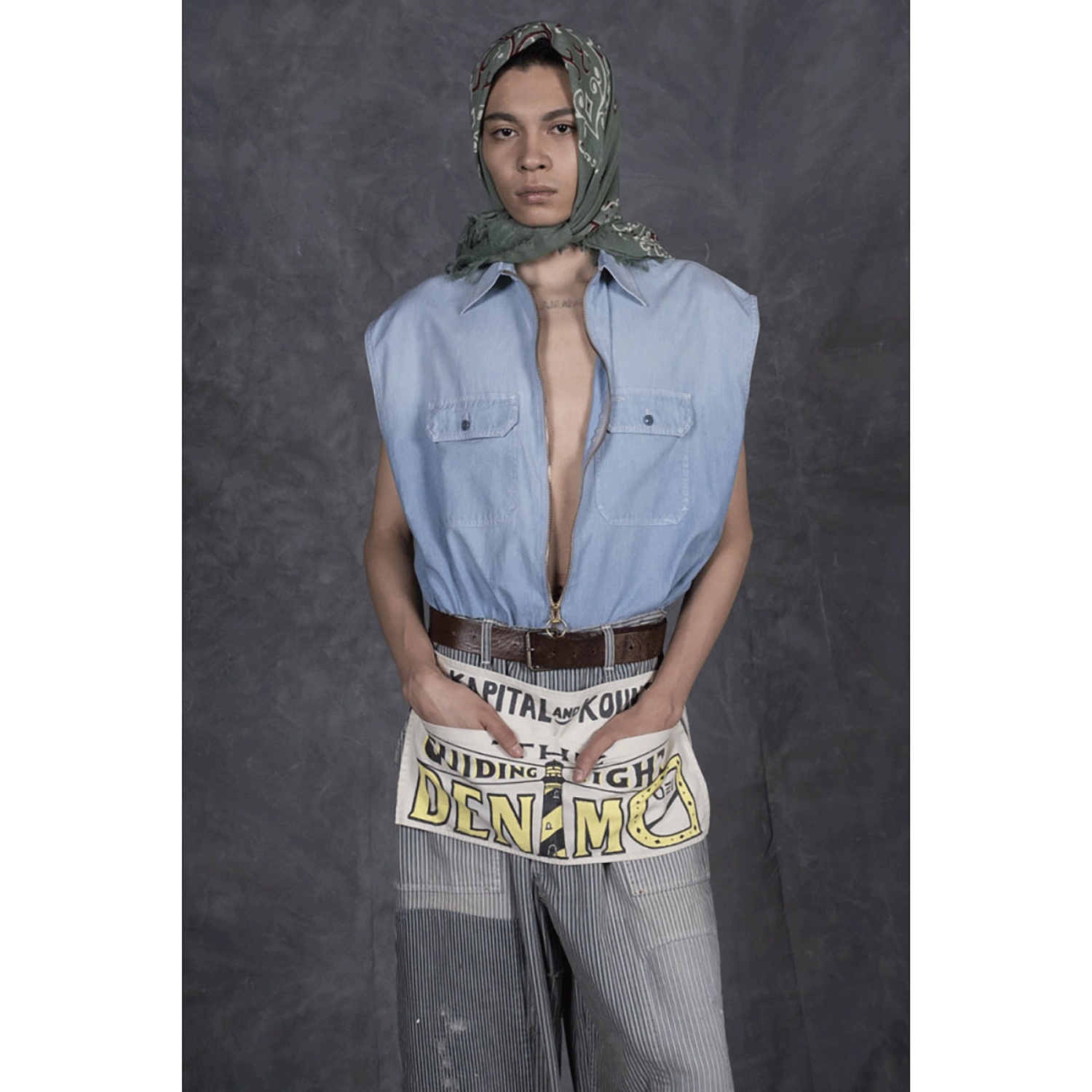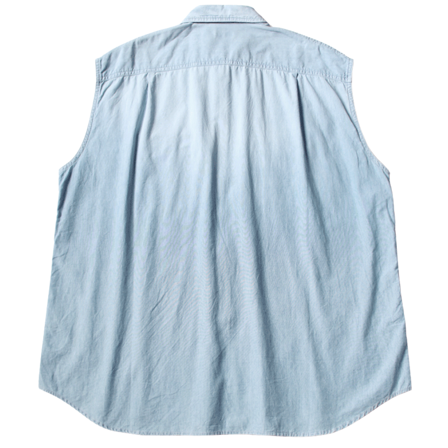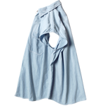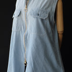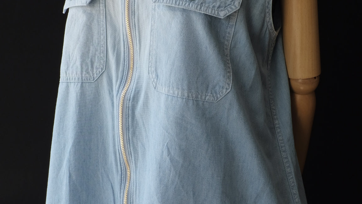 Treated to give a vintage look and feel, the Chambray Zipper Work Shirt is a versatile option to wear as a light overlayer. Light in weight with concise pleats at back, this shirt drapes nicely without feeling too bulky. Detailed with a gold two-way zipper and ring pulls. Fits true to size for an oversized fit. Mannequin has a 34" bust and is wearing the size 1.