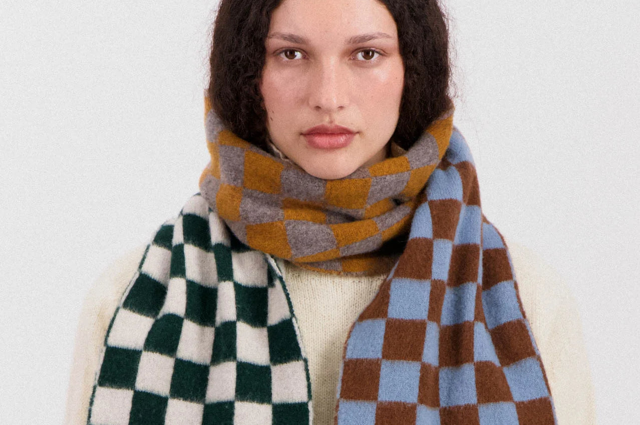 The Cosmic Checkerboard Scarf from Howlin is part of their signature Winter Collection and crafted in Scotland from 100% natural lambswool. Howlin's lambswool comes from the first shearing of Merino breed of sheep which is known to produce the softest and finest wool. With its soft brushed feel, this colorful scarf is breathable, super warm and the perfect pairing when you want a pop of color!