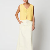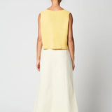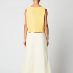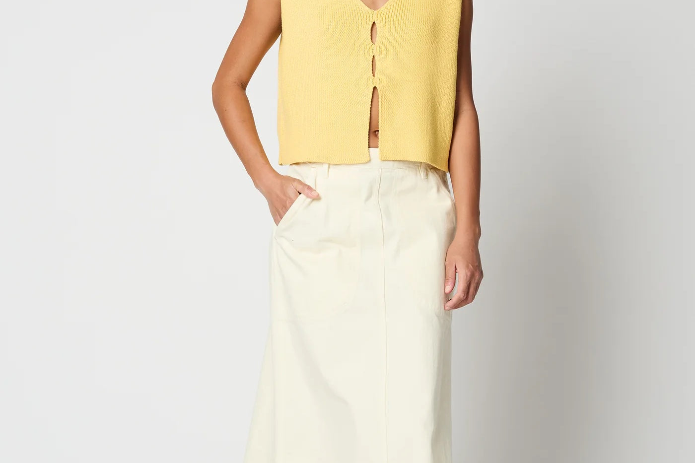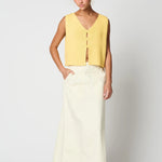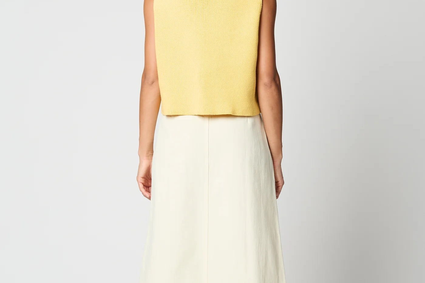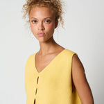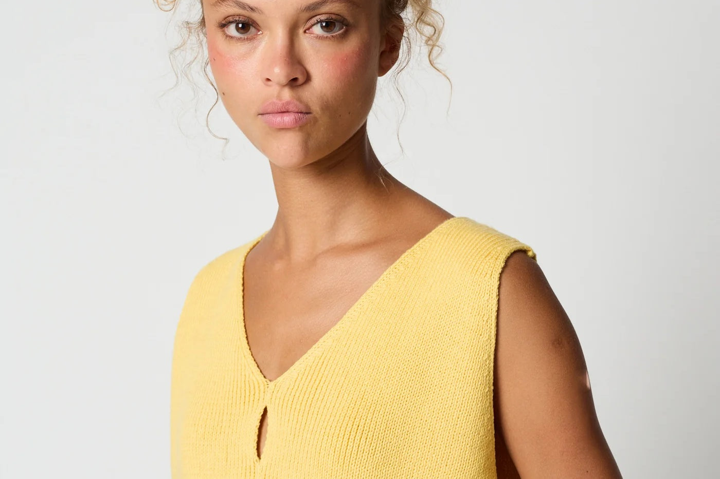 The Darleen Top from Atelier Delphine is knit from Tanguis cotton, a sustainable high-quality fiber grown in Peru, known for its softness, strength and durability. This midweight ribbed knit has an open work detailing along the front and designed with a boxy fit. Wear on its own or as a layer. Model is 5' 8" and wearing the Yellow color in a size S.