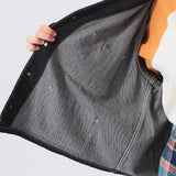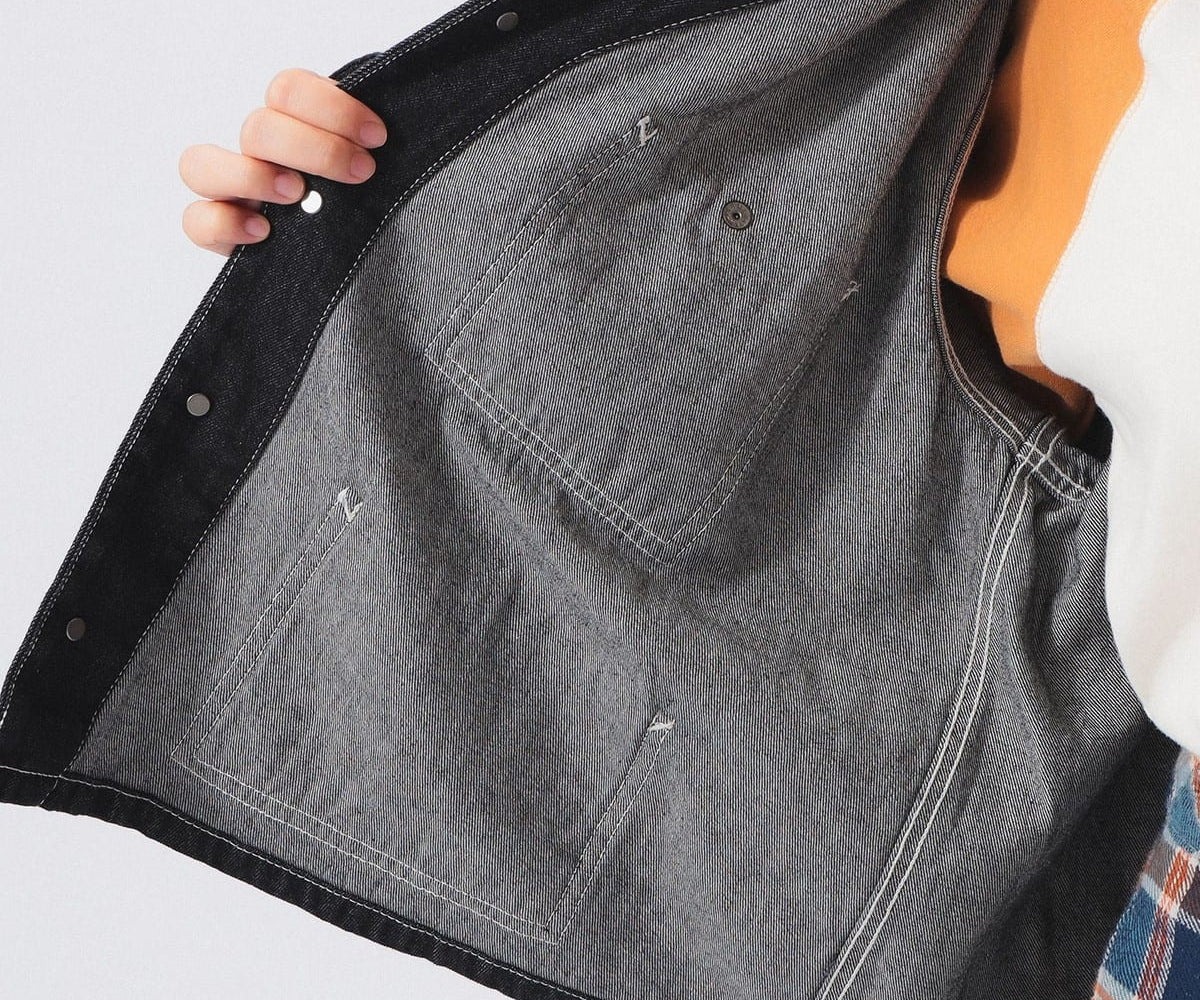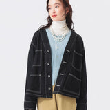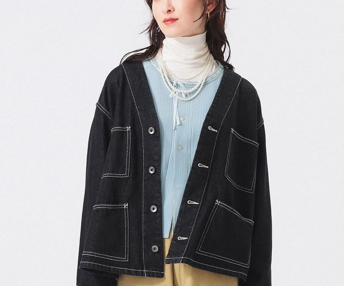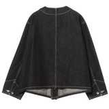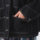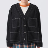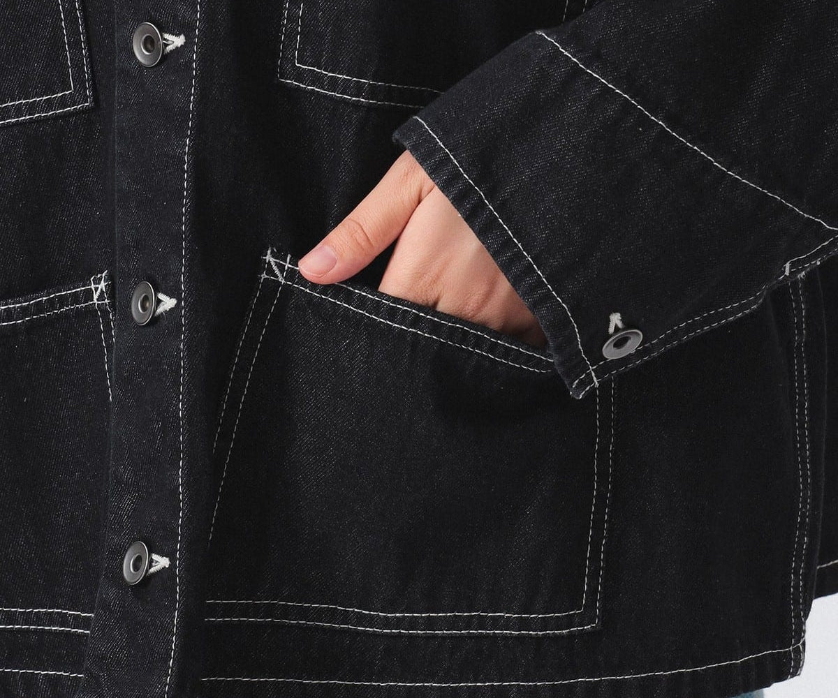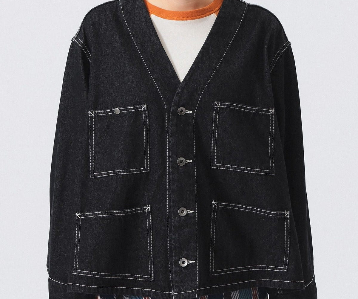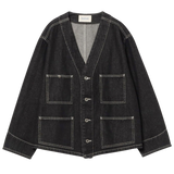 Based on a 1940s engineer jacket, The Denim Engineer Jacket has been updated and designed with an oversized fit, contrasting stitching throughout and a deep V-Neck. A classic style, easily layered and versatile for everyday wear. Detailed with button closure, wrist plackets, front patch pockets and snap closure at chest pocket. Fits true to size for an oversized fit.