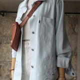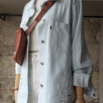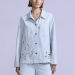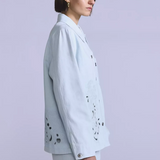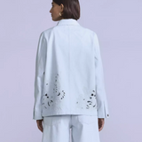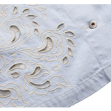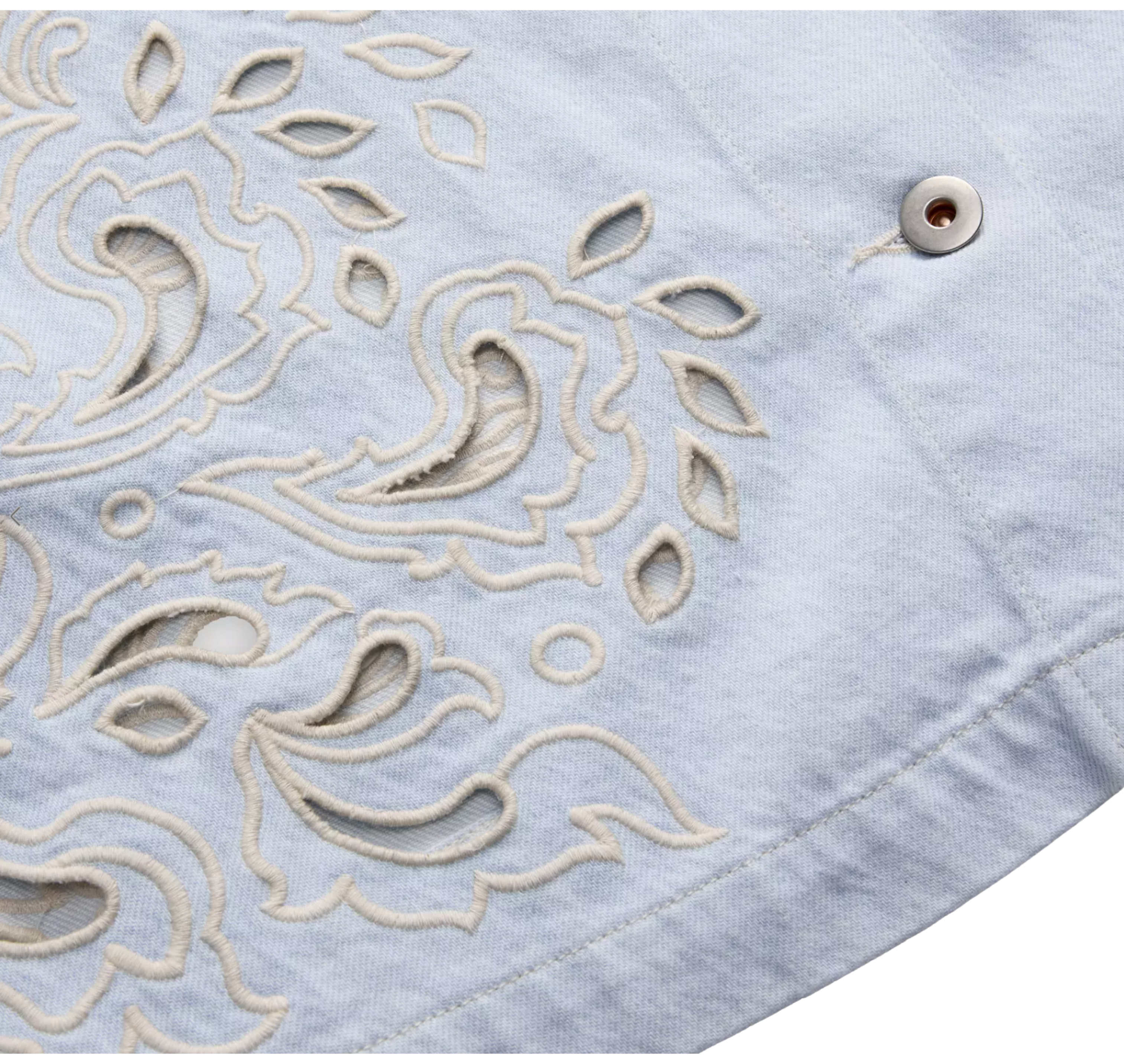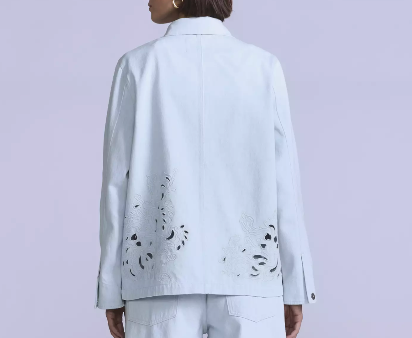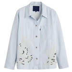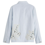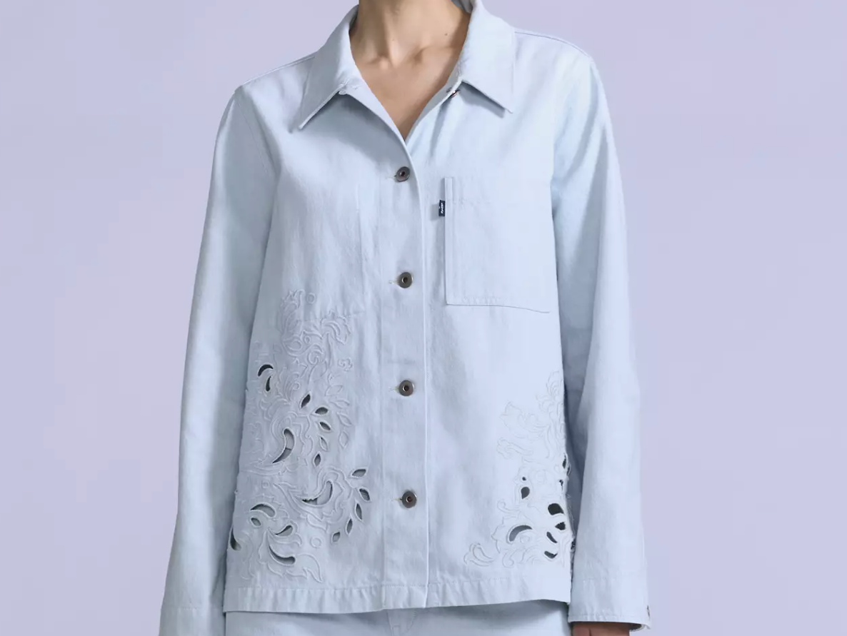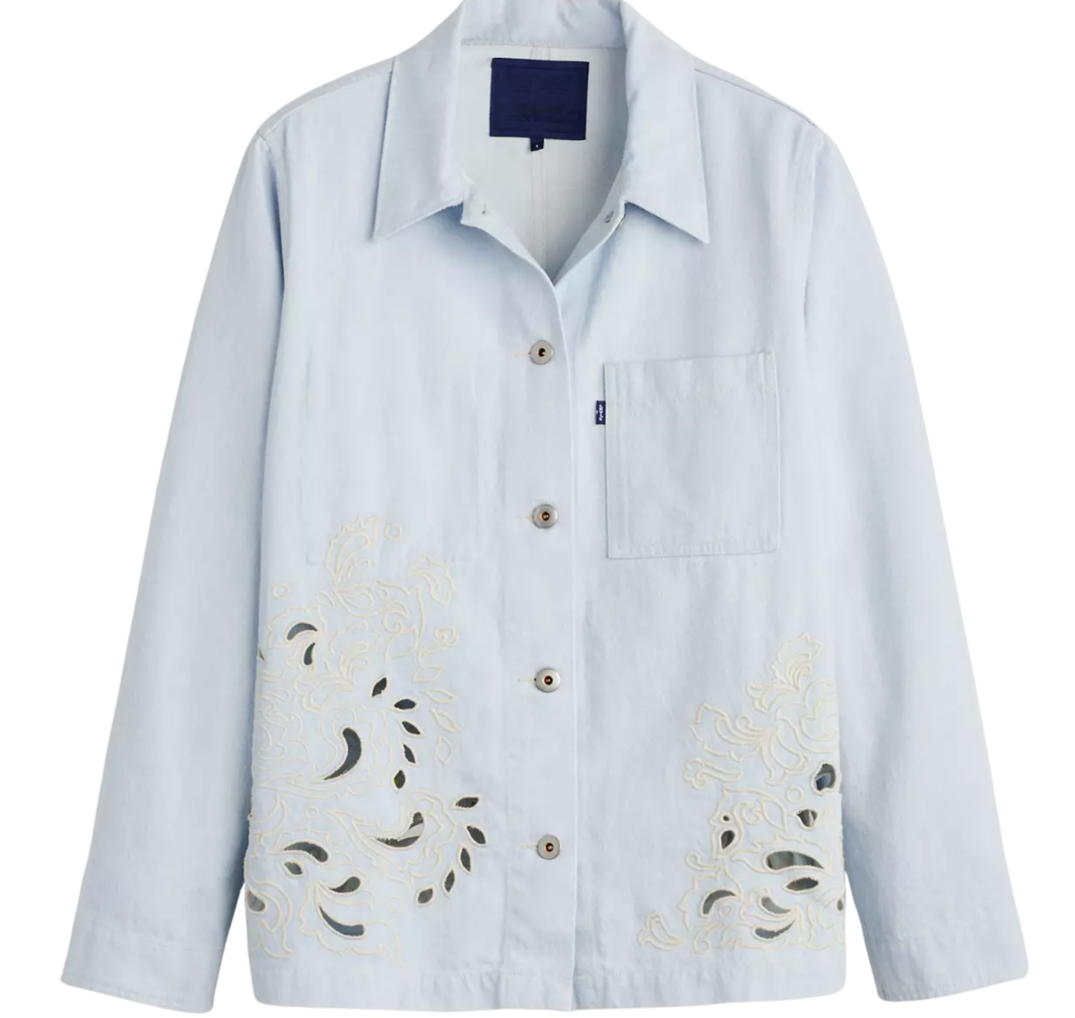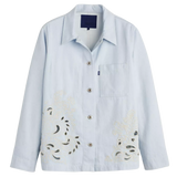 The Embroidered Bandit Jacket from Levi's Blue Label took the shape of the iconic Trucker Jacket and gave it a structured upgrade with premium Japanese denim. Part of an elevated collection where time honored techniques meet modern silhouettes for a tailored look. Detailed with embroidered cut out design, metal button closure and finished with a single patch pocket at chest. Fits true to size for a relaxed fit. Model is 5'9" and wearing a size Small. Mannequin has a 34" bust and is wearing a size Small.