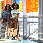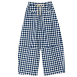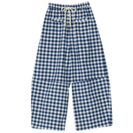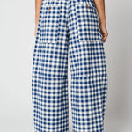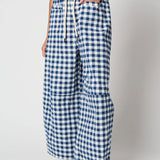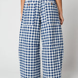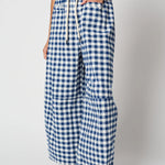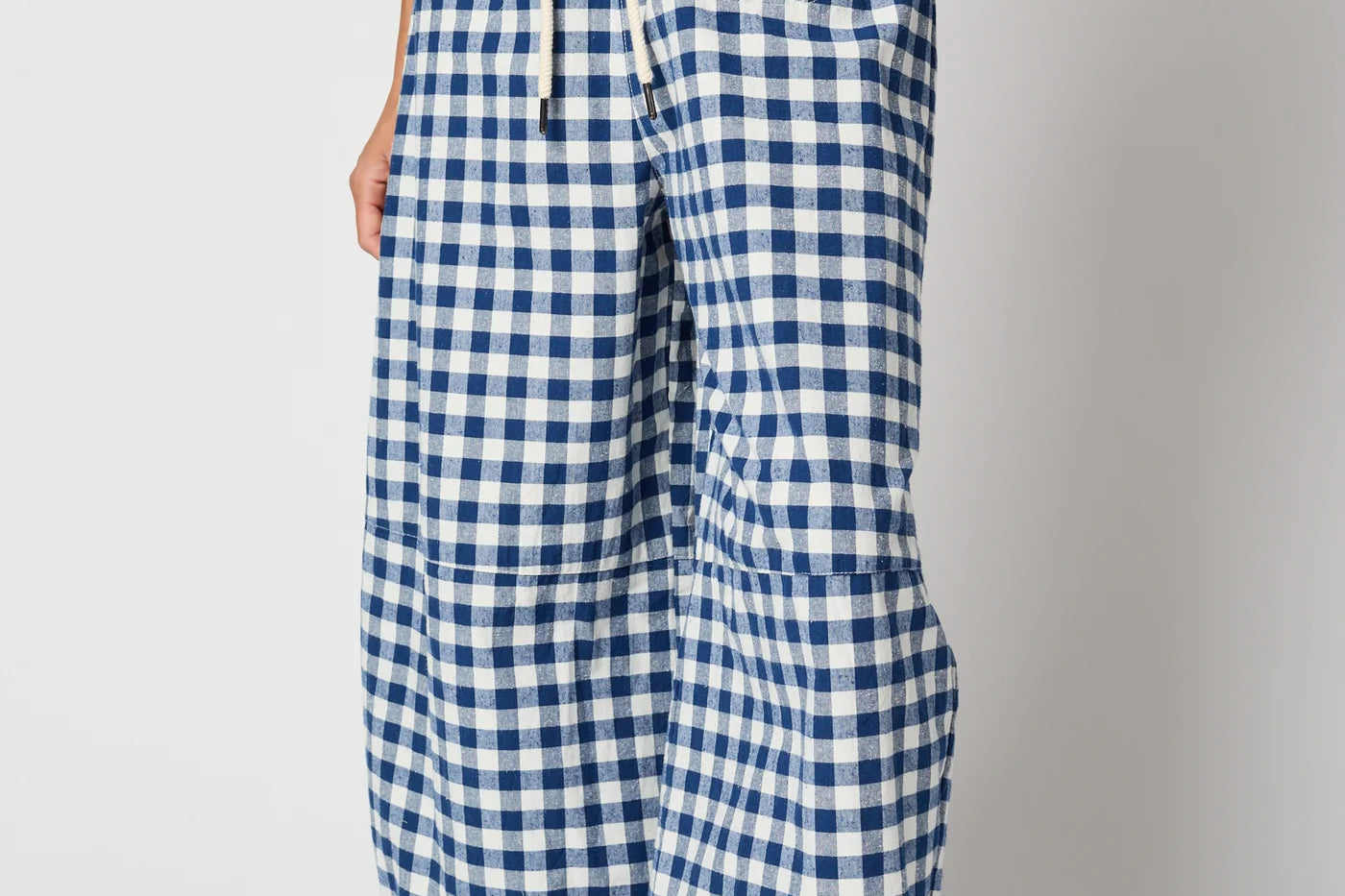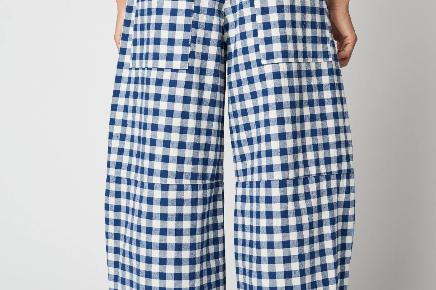 The Hannah Pant from Atelier Delphine is made from 100% raw silk in their favorite gingham check. This lightweight barrel trouser is a warm weather go-to for an effortless, yet elevated, look. Styled with an easy-on waist with a relaxed, fulllength silhouette. Detailed with drawstring waist detail, front & rear pockets. Model is wearing a size Small and Neenie is wearing a size medium. Fits true to size.