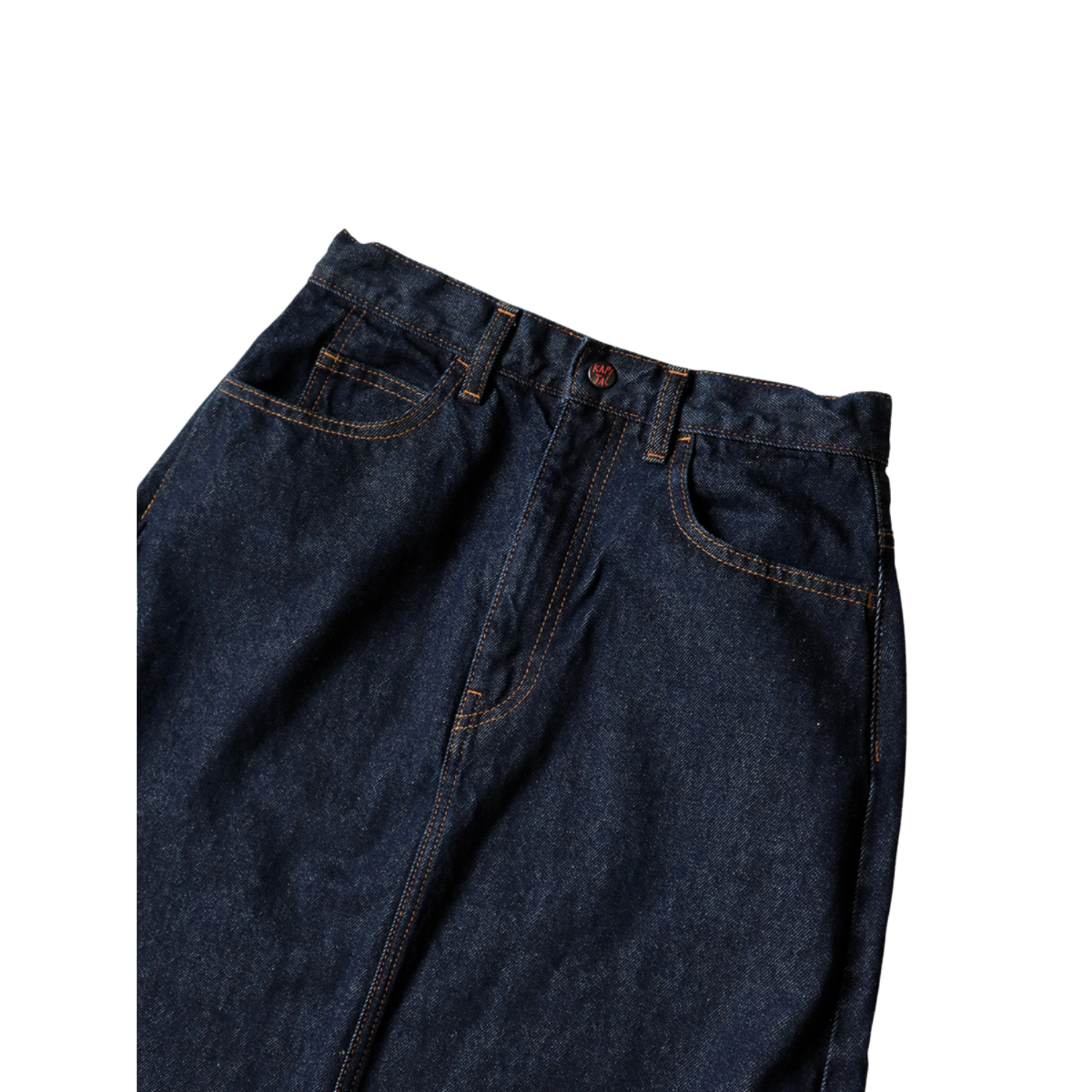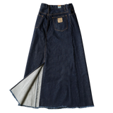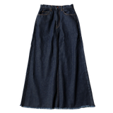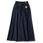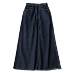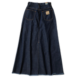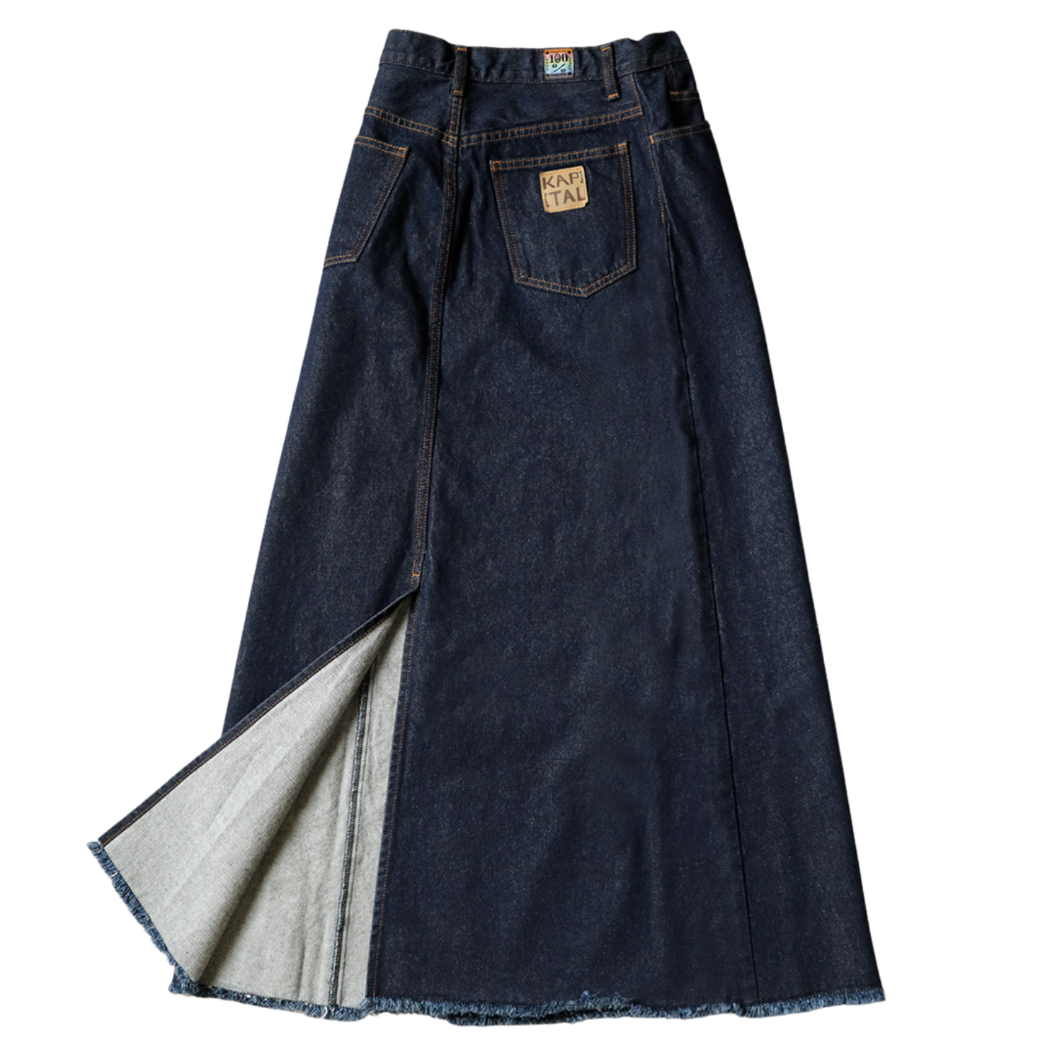 The High Waist Maxi Skirt from Kapital is made from a 13oz. Indigo Denim and is designed with a high waist, classic 5-pocket styling and a back slit for ease of movement. The clean A-Line silhouette has a fringe at them and finished with leather Kapital patch at back pocket. Fits true to size for a slim fit at waist.