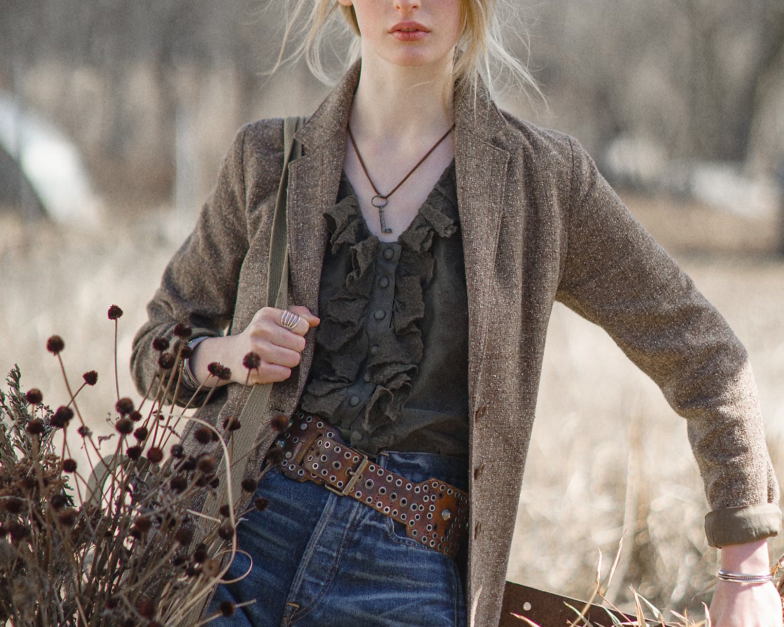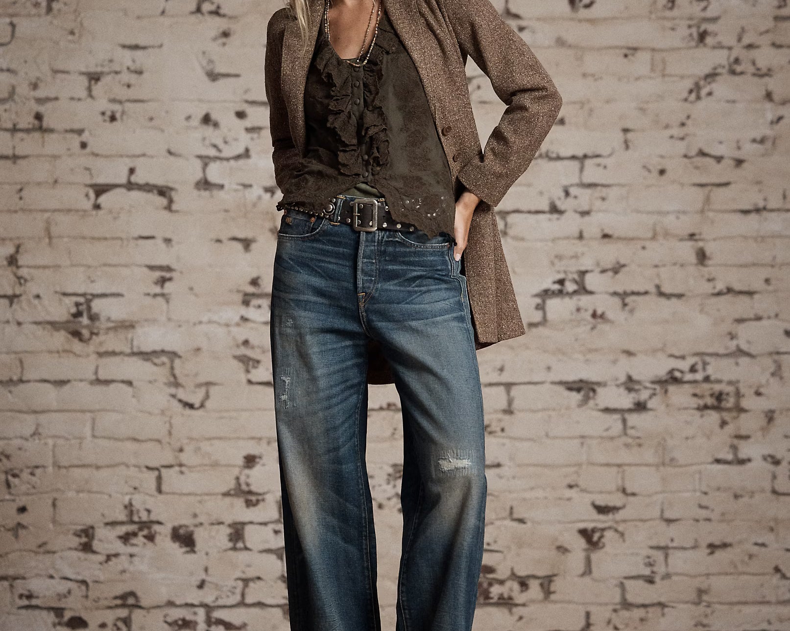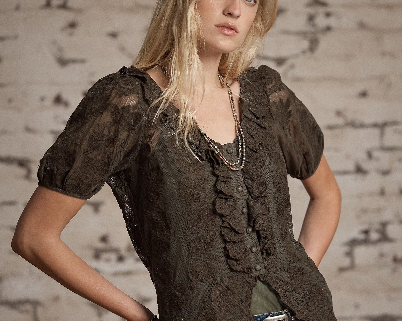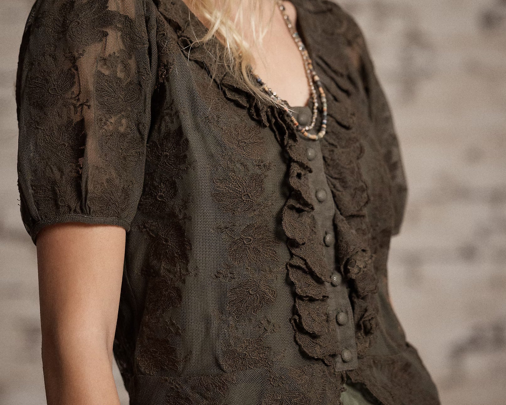 - Ruffle-trimmed neckline and placket