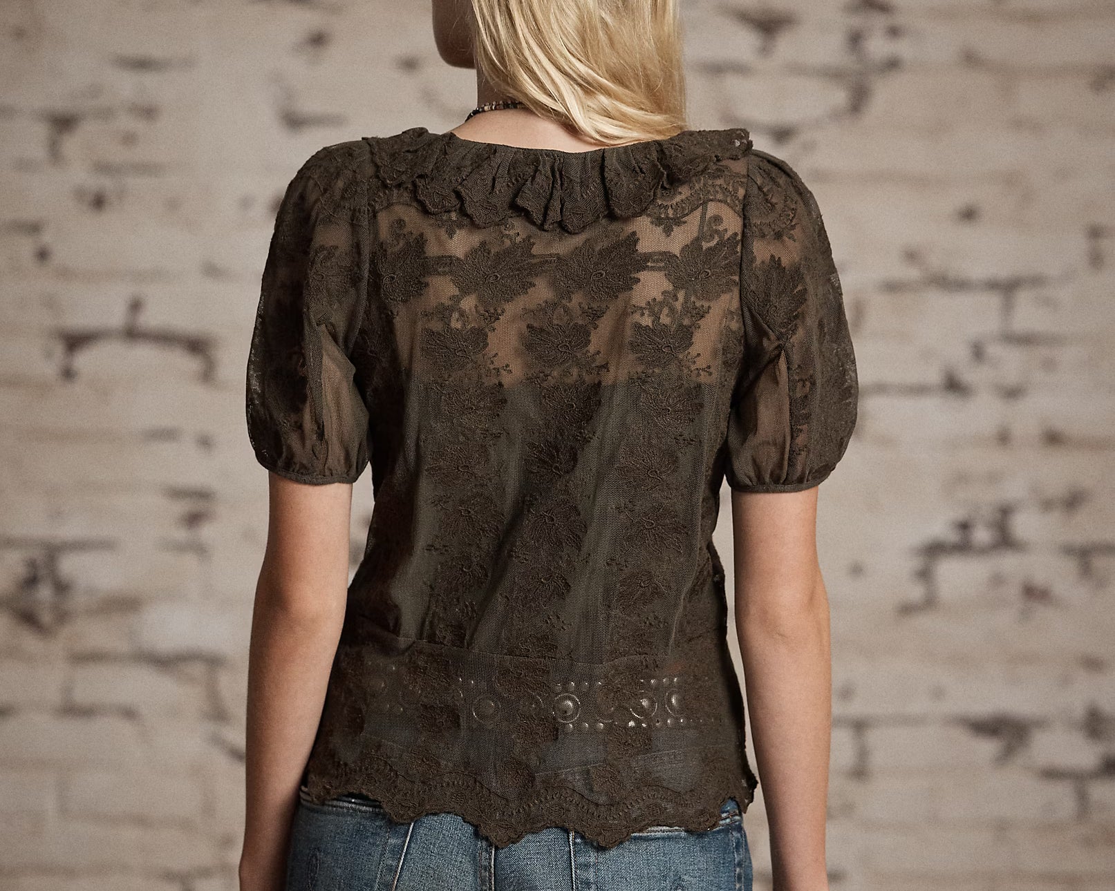 The Jenn Embroidered Lace Top is made with net lace that features tonal embroidery throughout. Featuring a delicate ruffle trim at the neckline and placket, peplum hem and self-covered buttons. A nostalgic, yet timeless design pairing great with jeans or dressed up with a tailored pant. Comes with a removable camisole. Model is 5'10" and is wearing a size 2.