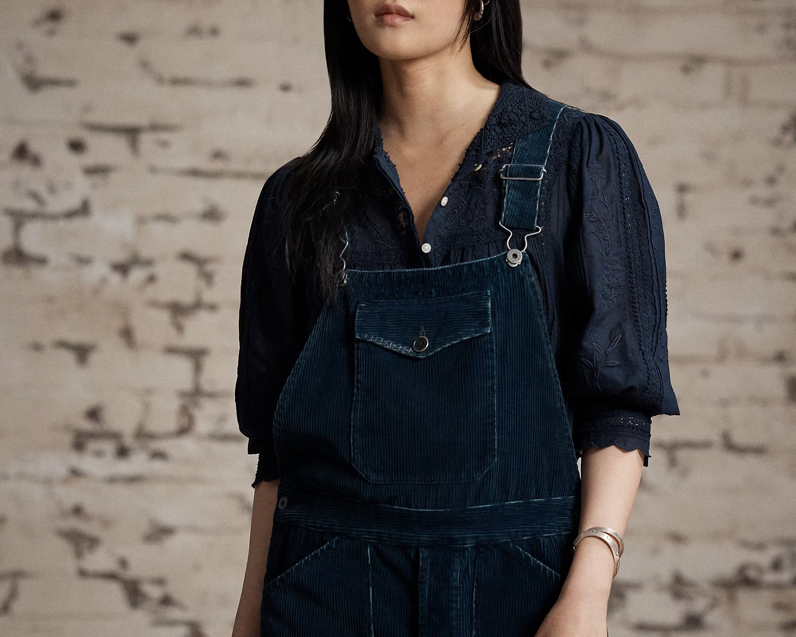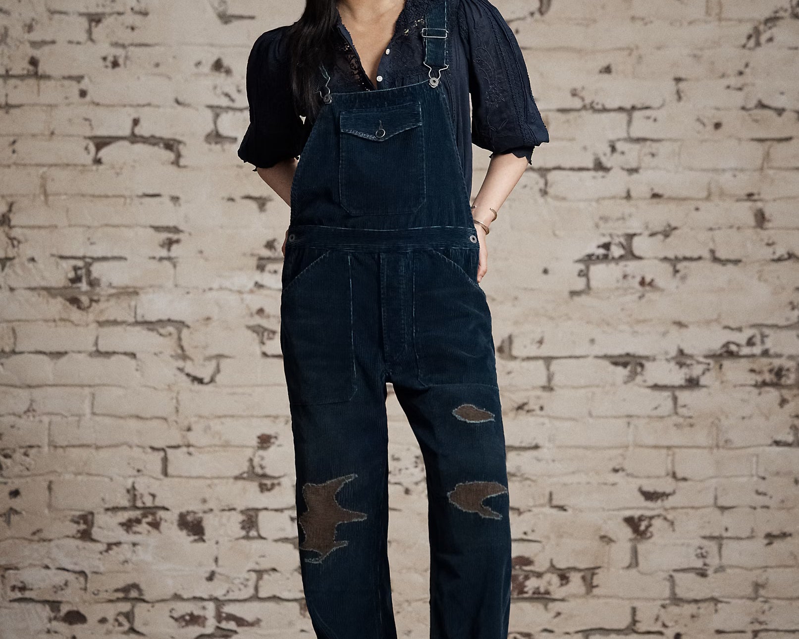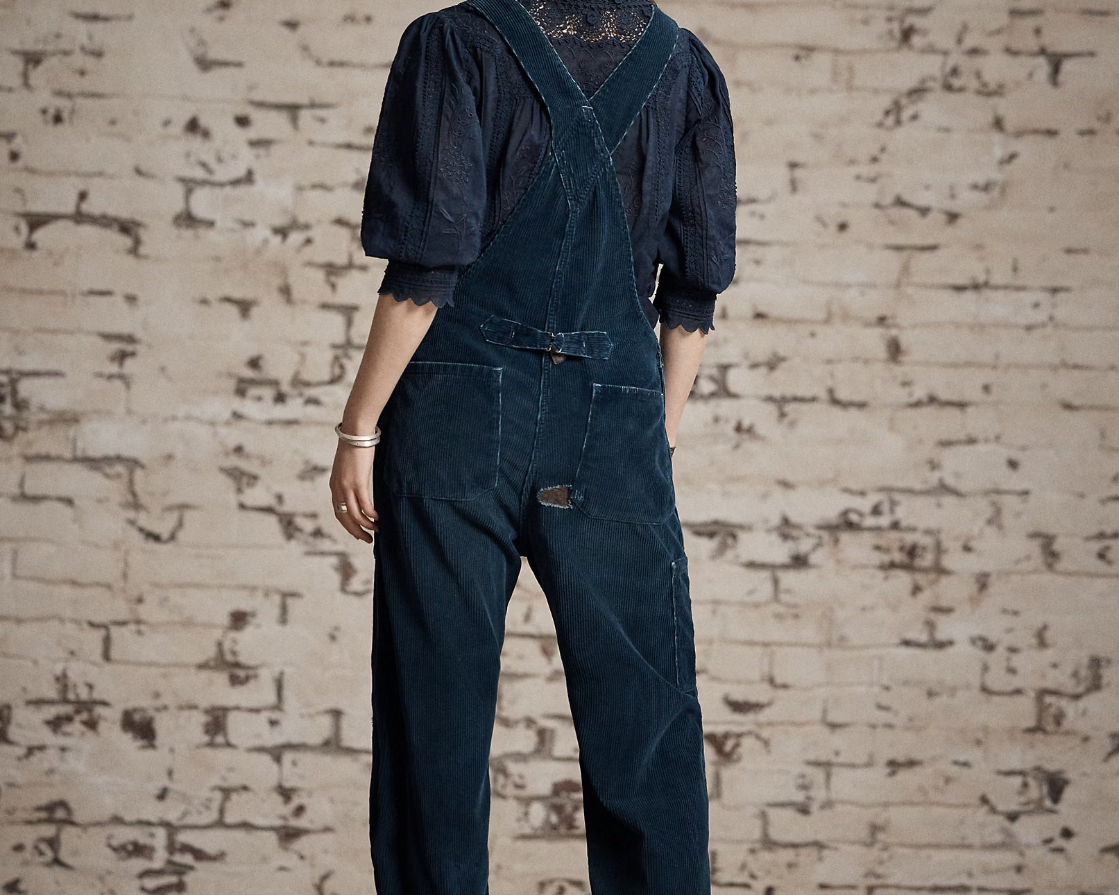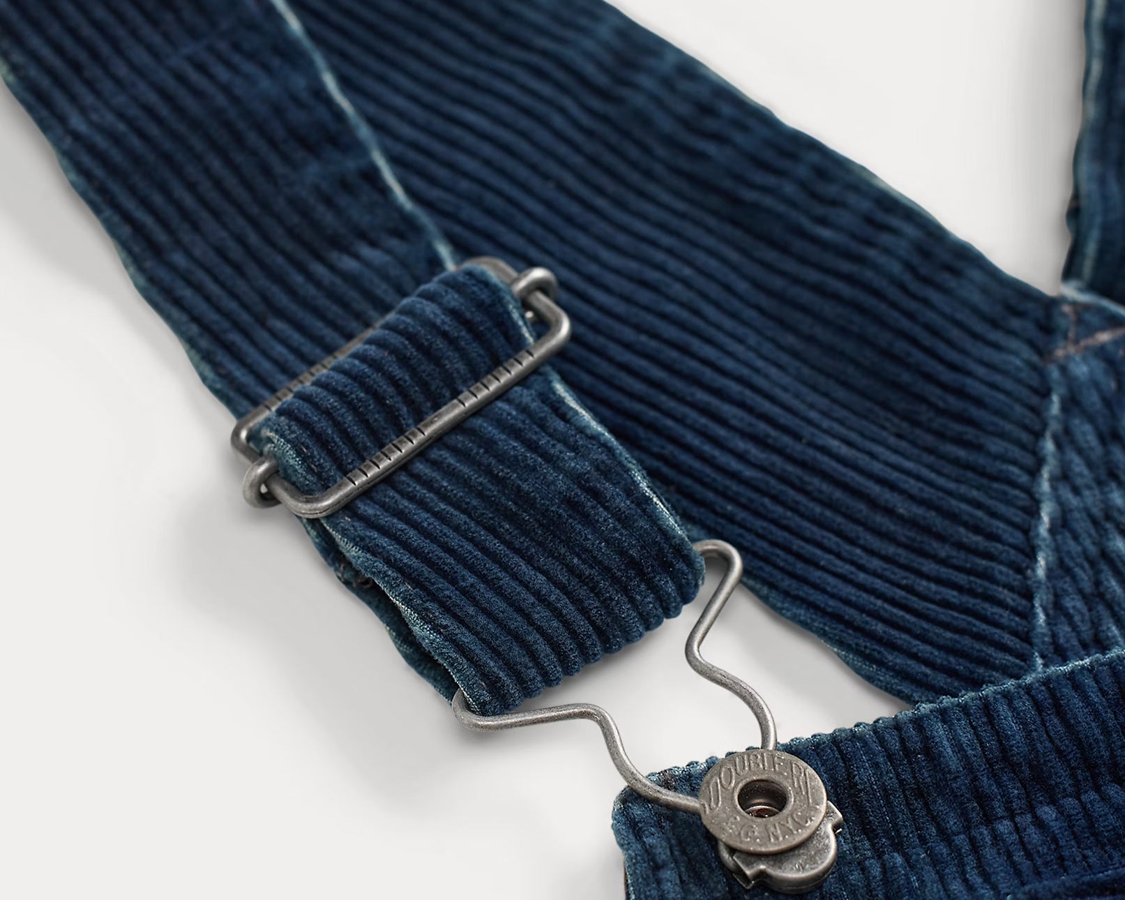 The Kitty Overall from RRL is made from wide-wale, 100% cotton corduroy from Japan. Dyed with true indigo and repaired with corduroy cloth sourced from a storied French Mill. The straight leg silhouette gives it a classic feel and detailed with adjustable buckled back, adjustable shoulder straps, button fly and two front waist angled pockets. Heavily washed and distressed for a lived-in feel. Model is 5'10" and is wearing a size 2.