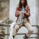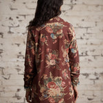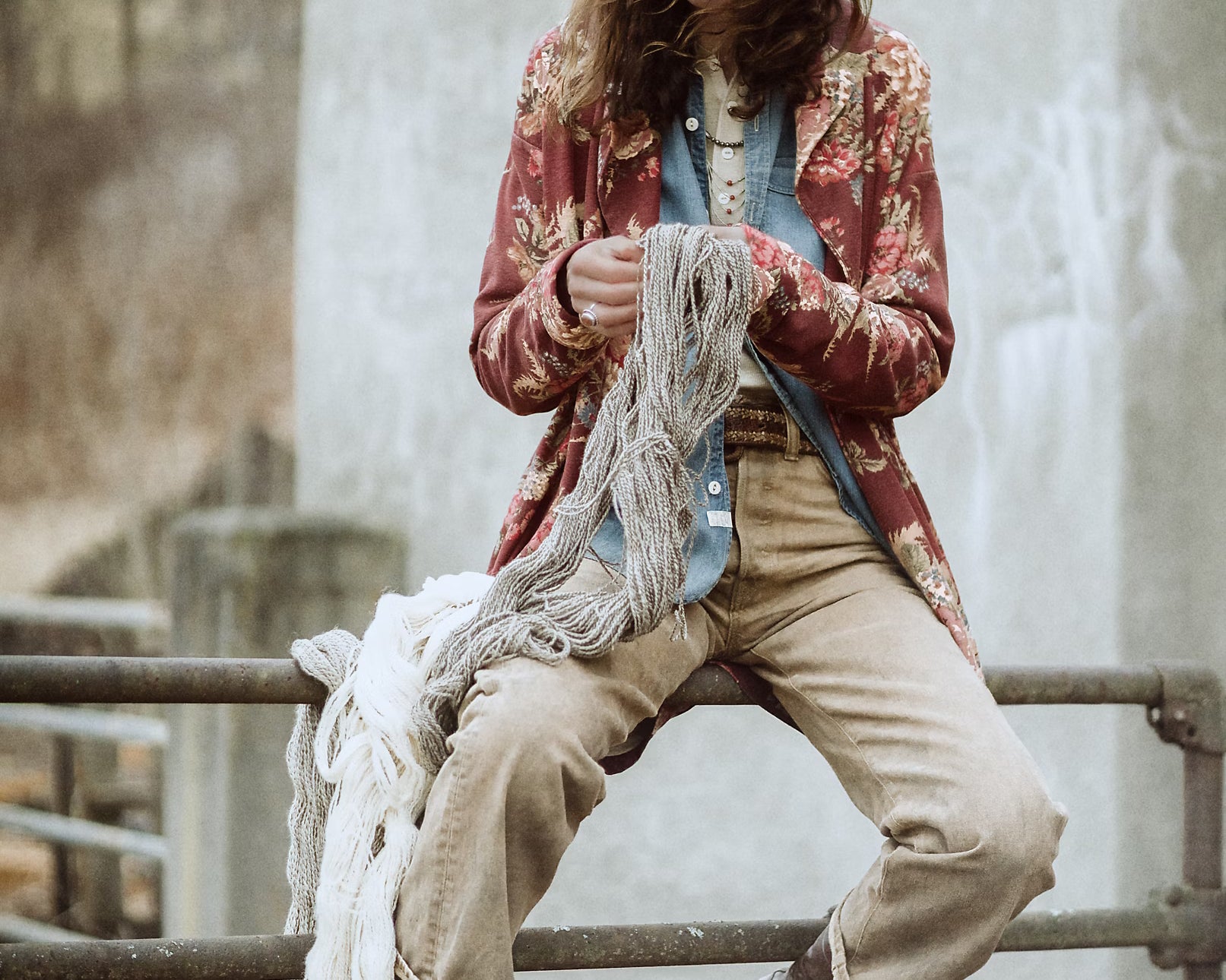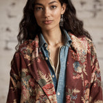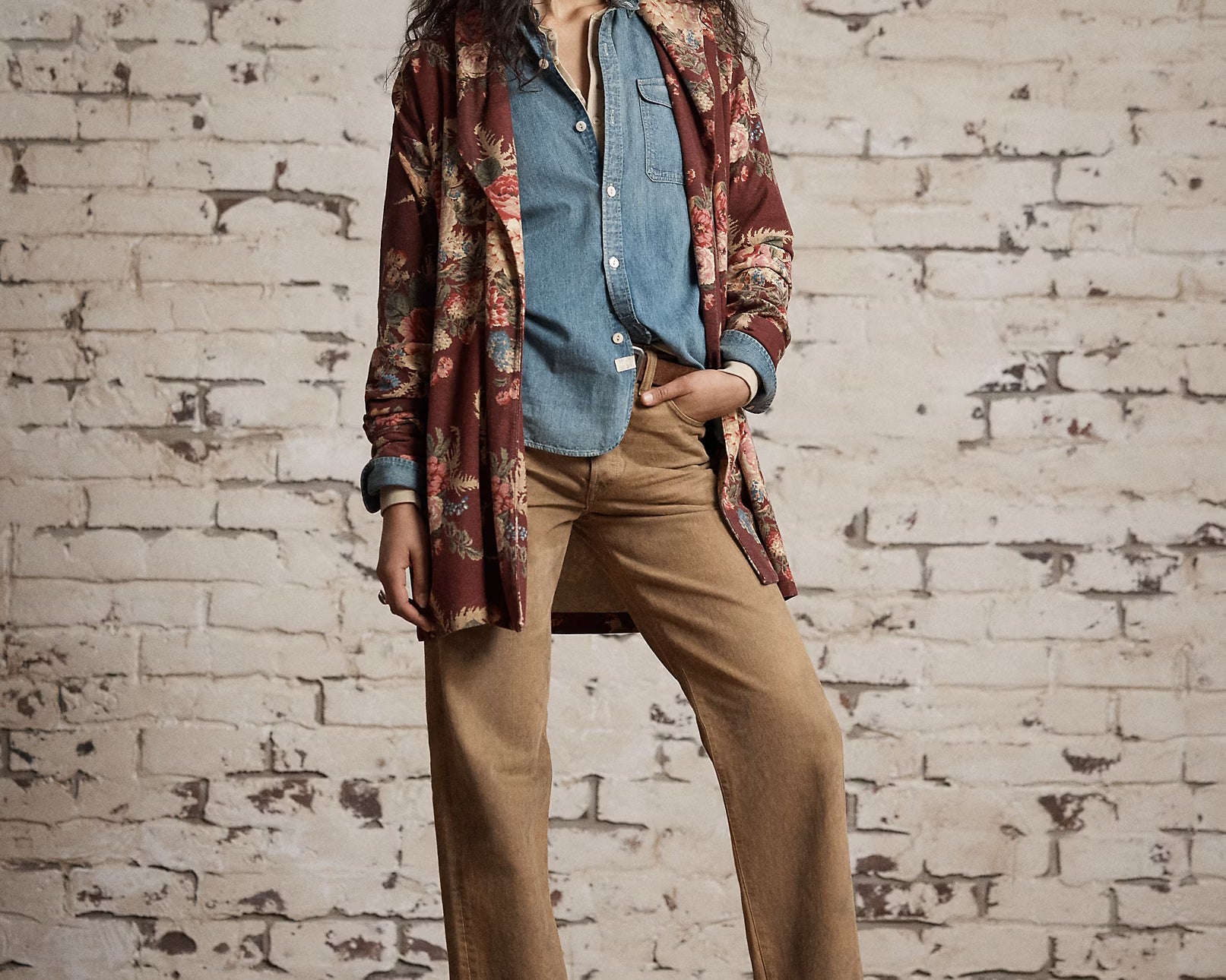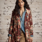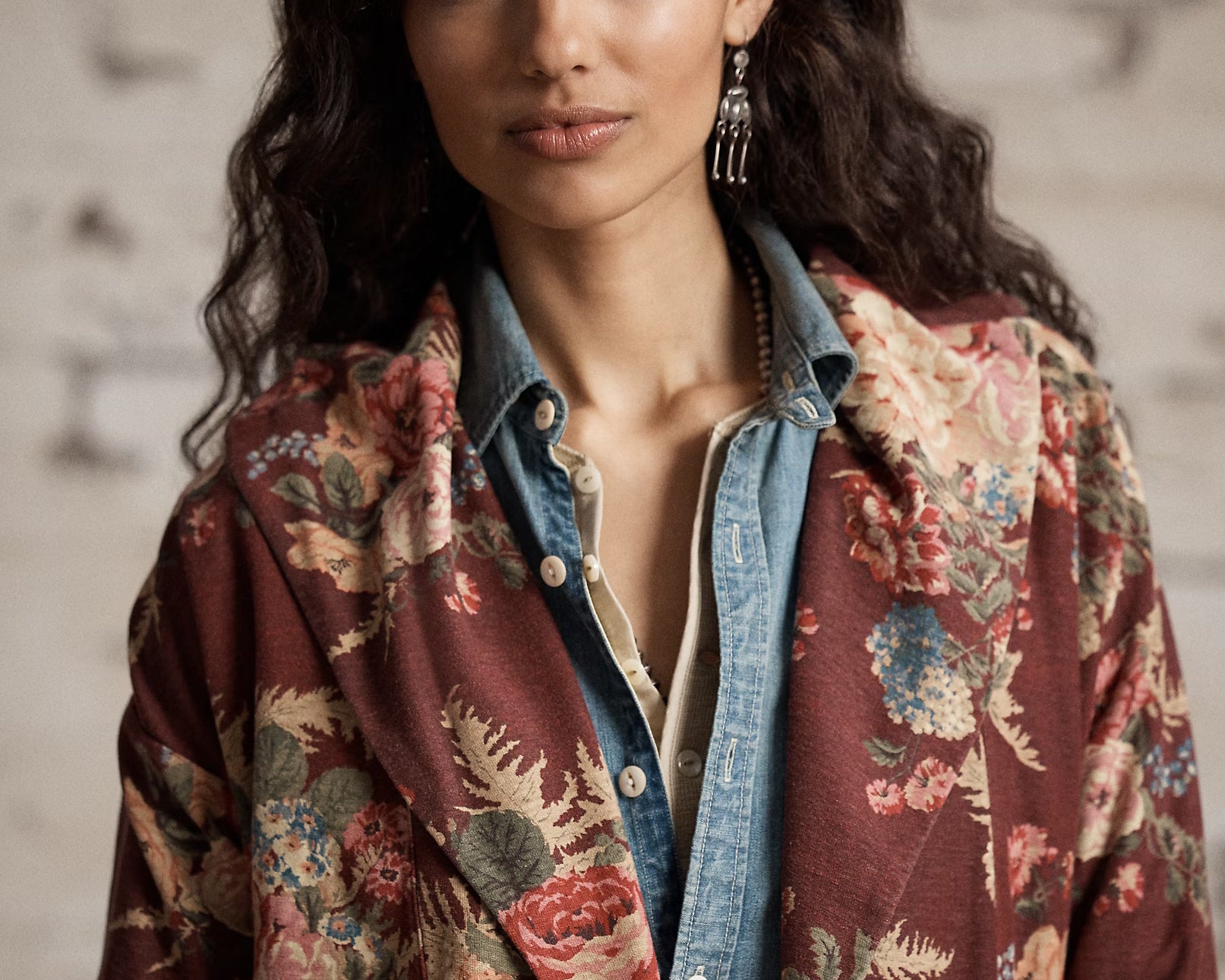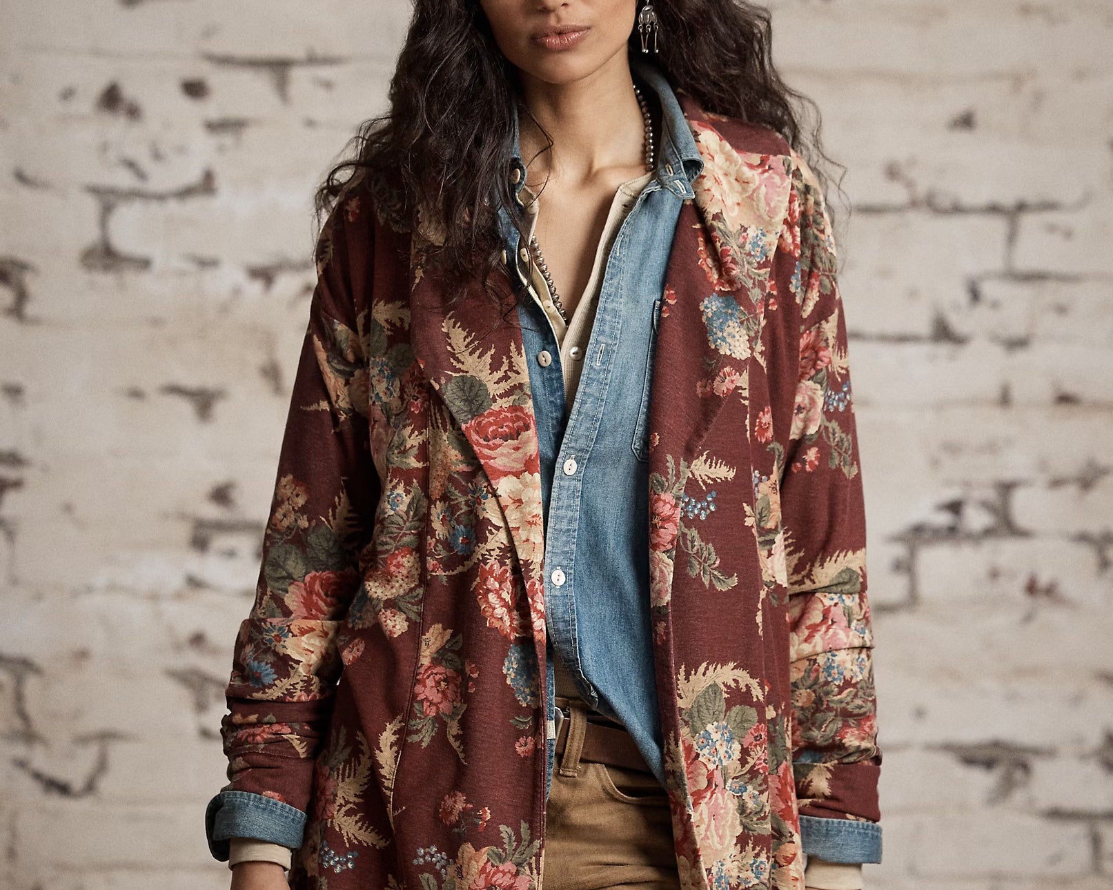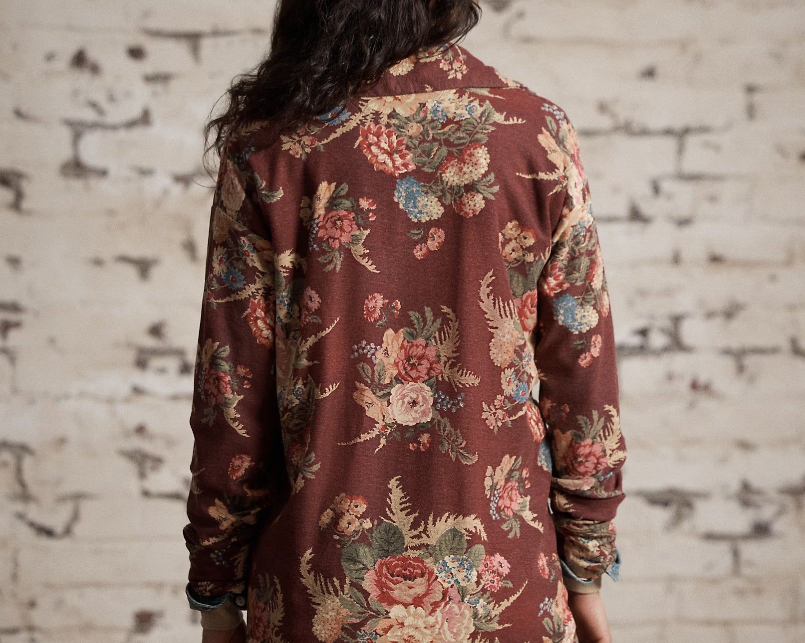 The Maeve Duster from RRL is a versatile over layer made from a heavyweight linen-and-cotton jersey. Inspired by a vintage floral print with an allover pattern featuring blooms of roses, hydrangea, ferns and delphinium. Designed with a relaxed silhouette, open front and wide shawl collar. Fits true to size. Model is 5'10" and is wearing the size 2.