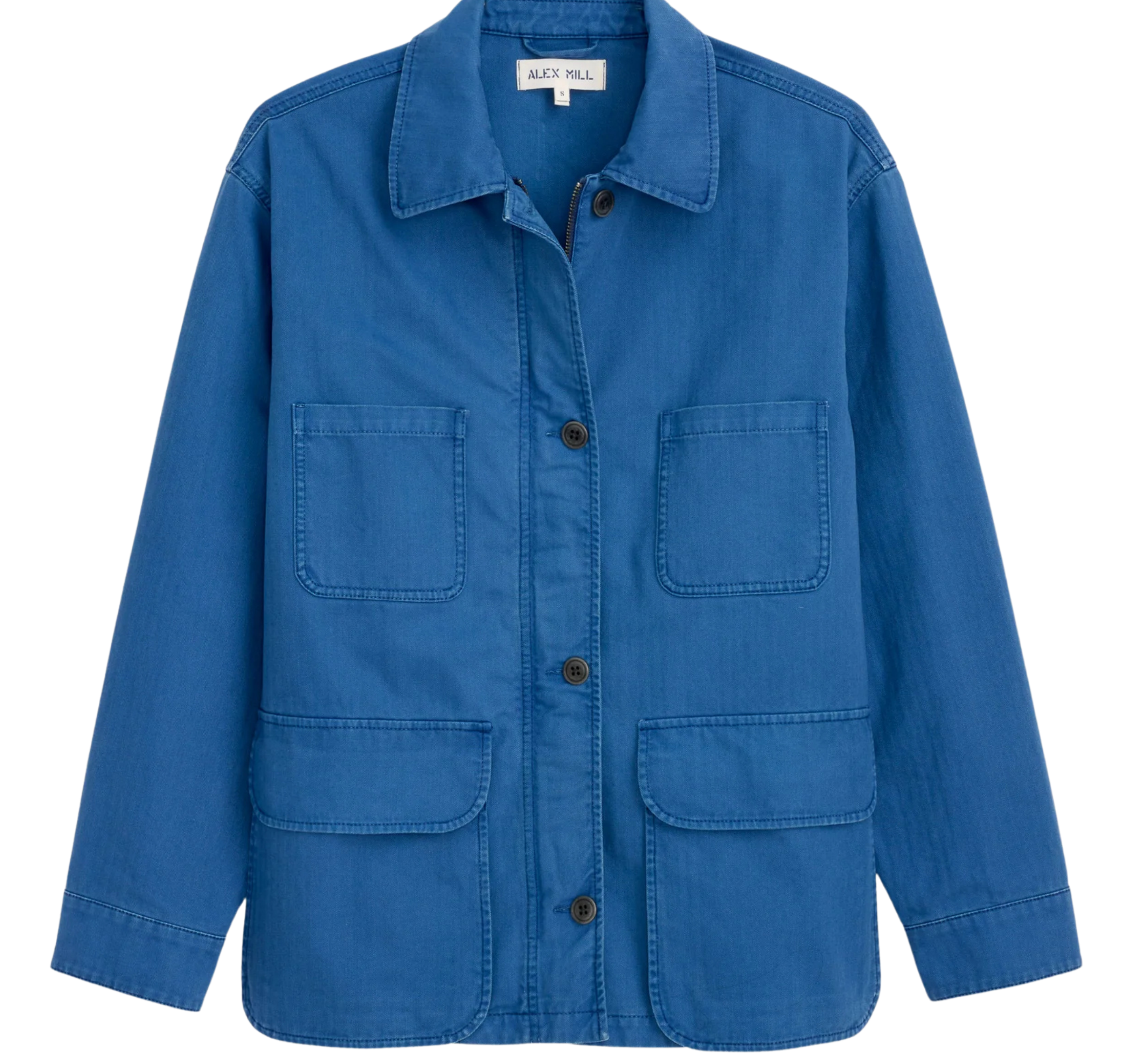 The Massie Jacket from Alex Mill is made from durable cotton herringbone (originally used in military uniforms for durability) and garment dyed in a fresh color for Spring. Designed with a relaxed fit, hip length hem and is great for layering. Detailed with a zip or button closure, multiple pockets and wrist closures. Finished with Flat felled seams that are incredibly strong, durable with no raw edges exposed. Model is 5'11" and wearing a size Small. We recommend sizing down if you prefer a less oversized fit.