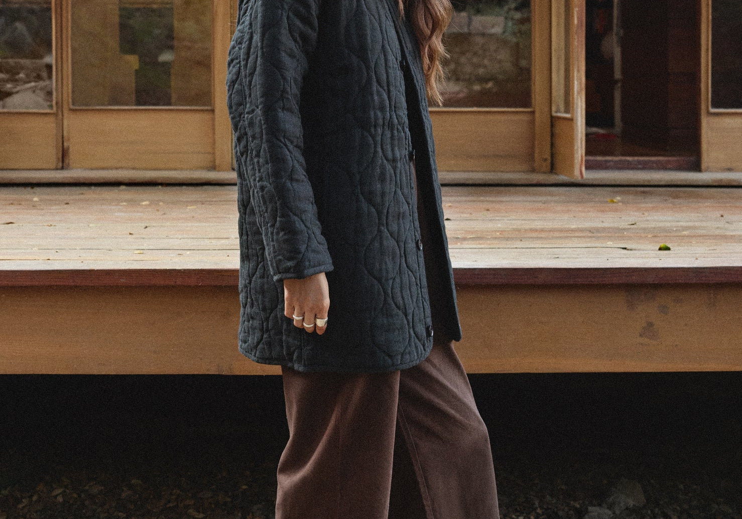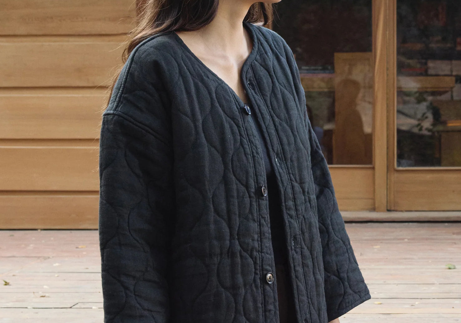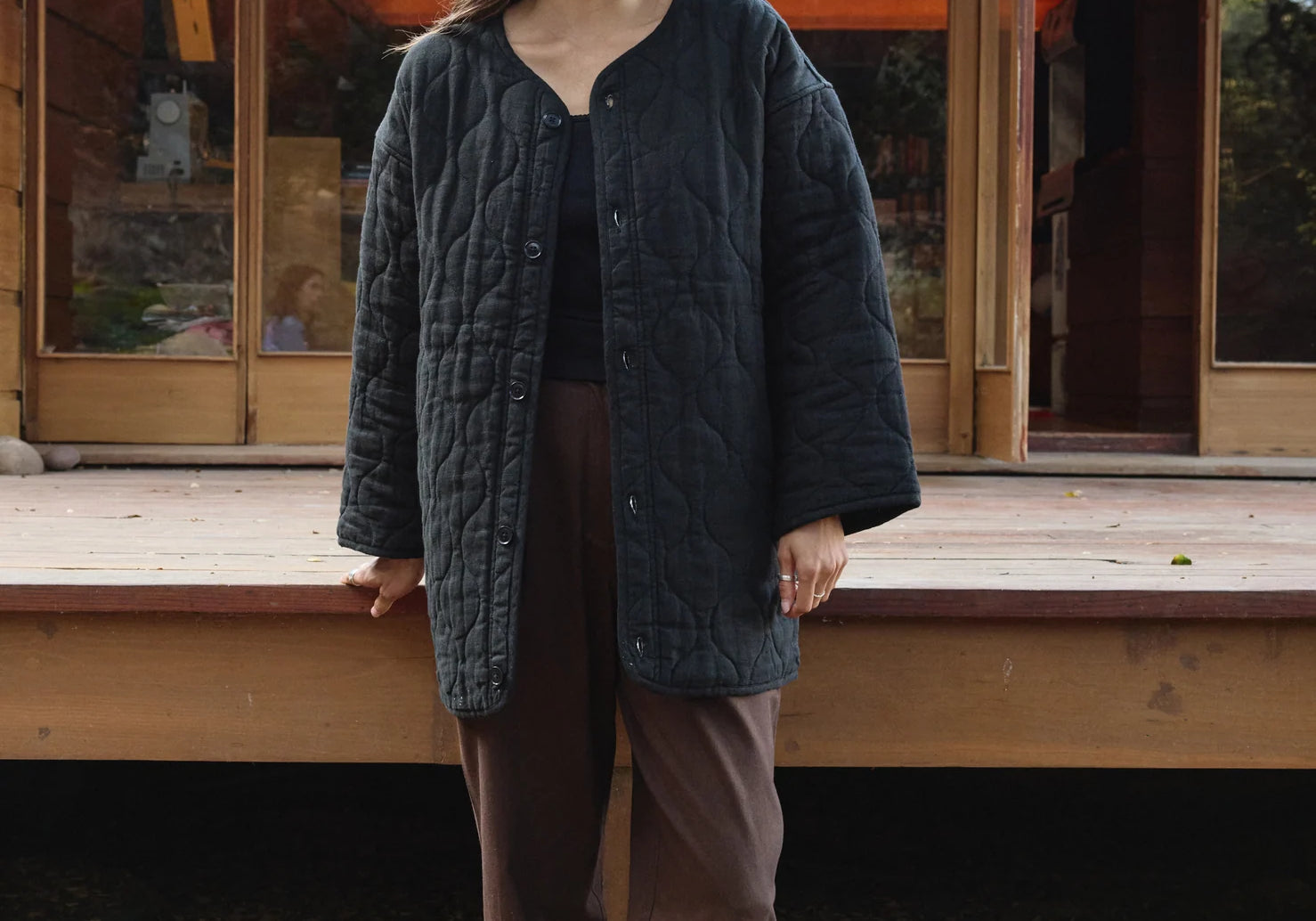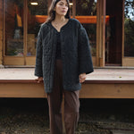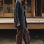 The Quilted Long Coat from First Rite is back this season with an updated range of linen and cotton fabric. This structured jacket is an easy layer for passing seasons and works well for layering in the chilly months, or wear alone with a T-shirt come Spring. Designed with a longer length and straight fit, two front pockets, and tonal corozo nut buttons. Model is 5' 10" and wears a size Small. Fits true to size.
