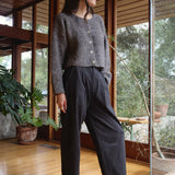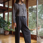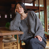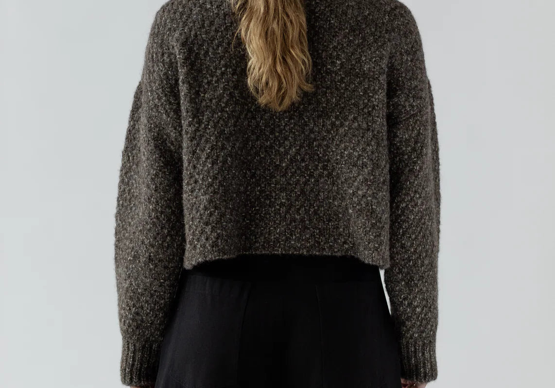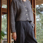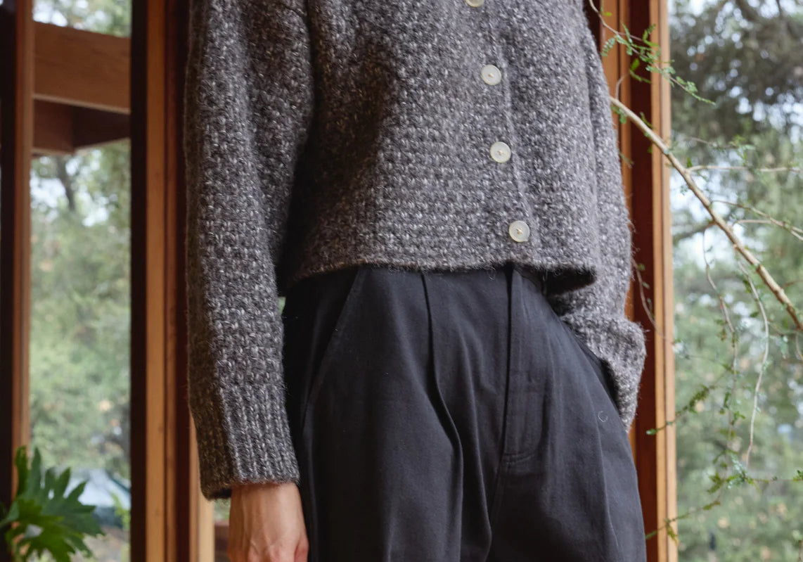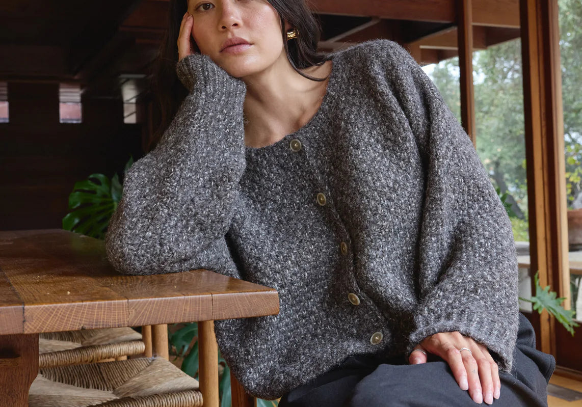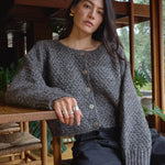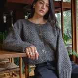 The Quinn Cardigan is a long time First Rite Customer favorite, knit from lofty Alpaca Cotton yarn. The blend of cotton and alpaca creates insulation and volume with a surprisingly light overall weight. The undyed yarns create a beautifully unique and subtle melange. Designed with a slightly oversized fit, intended to hit right below the natural waist textured and detailed with a chunky knit texture. Finished with horn buttons down the center. Model in studio is 5'9" and wears a size Small. Fits true to size for a relaxed fit. Made in a Fair Trade Peru certified facility.