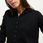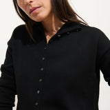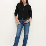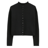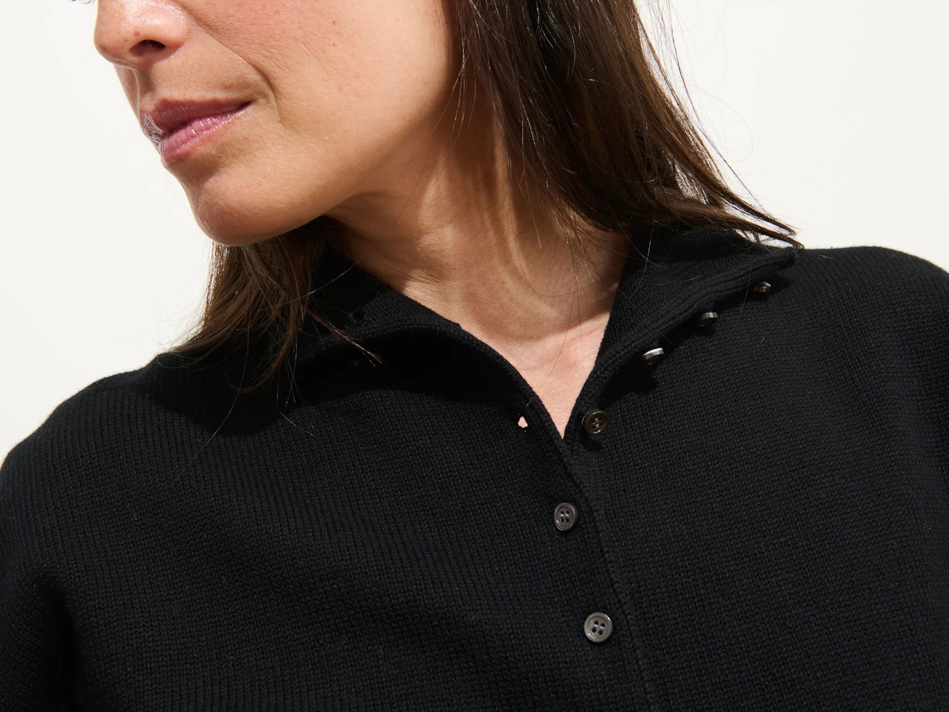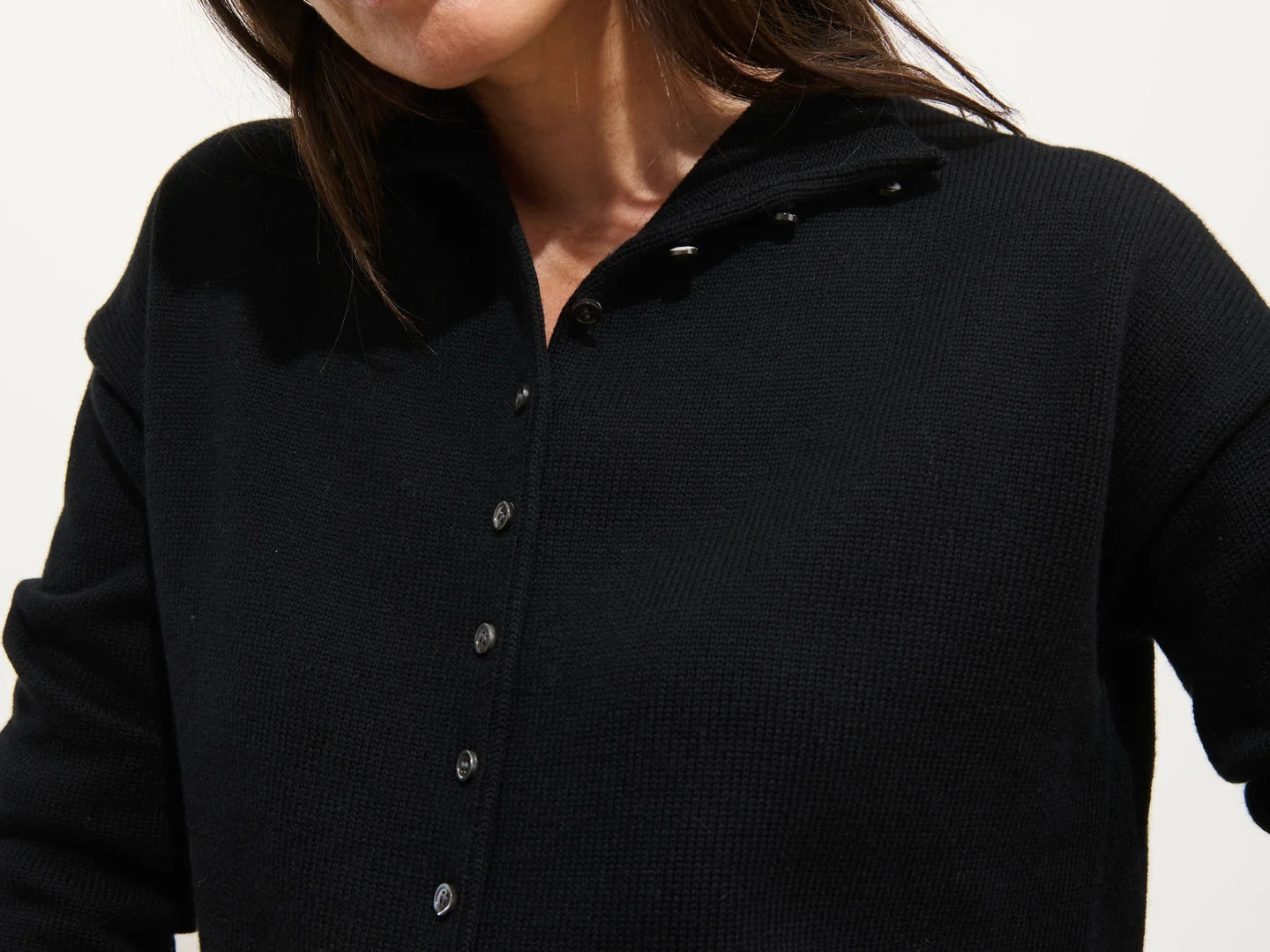 The Taylor Roll Neck Cardigan is made from an incredibly soft blend of cotton and cashmere with the versatility of styling many different ways. Wear as a cardigan or wear with buttons in the back for an easy pullover. Styled with a mock neck with rolled edge detail, fitting boxy in the body and fitted sleeves for a flattering fit. The straight hem allows for a French Tuck into your favorite high waisted pant. Fits true to size. Model is 5'8" and wearing the size Small.