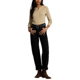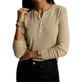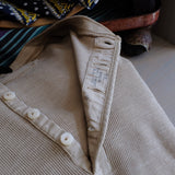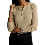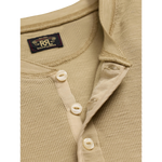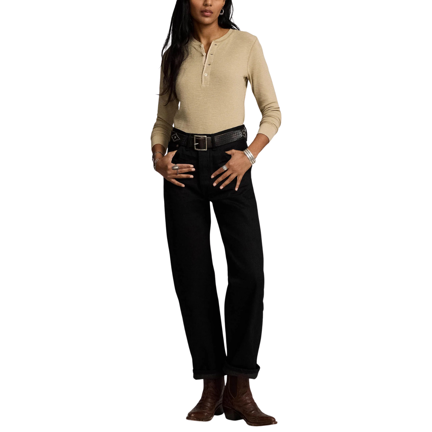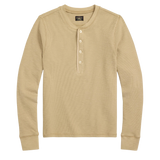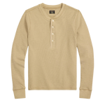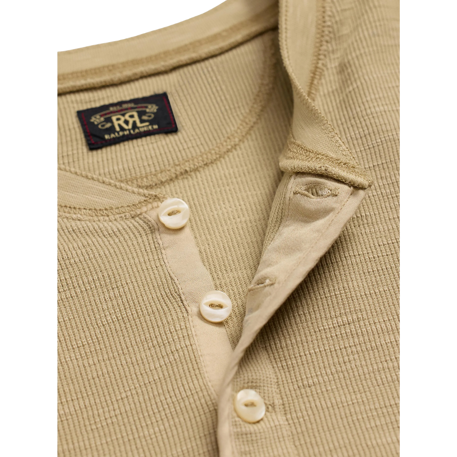 A classic waffle henley, tailored with a slim cut for easy layering. The soft, lightweight thermal knit is warm but breathable, finished with a sateen button placket, banded cuffs & triple-needle cover stitching for added structure. Fitting clingy at the bust and falling straight down around torso. The RRL Waffle Henley is a contemporary take on a piece that will never go out of style. Fits true to size.
